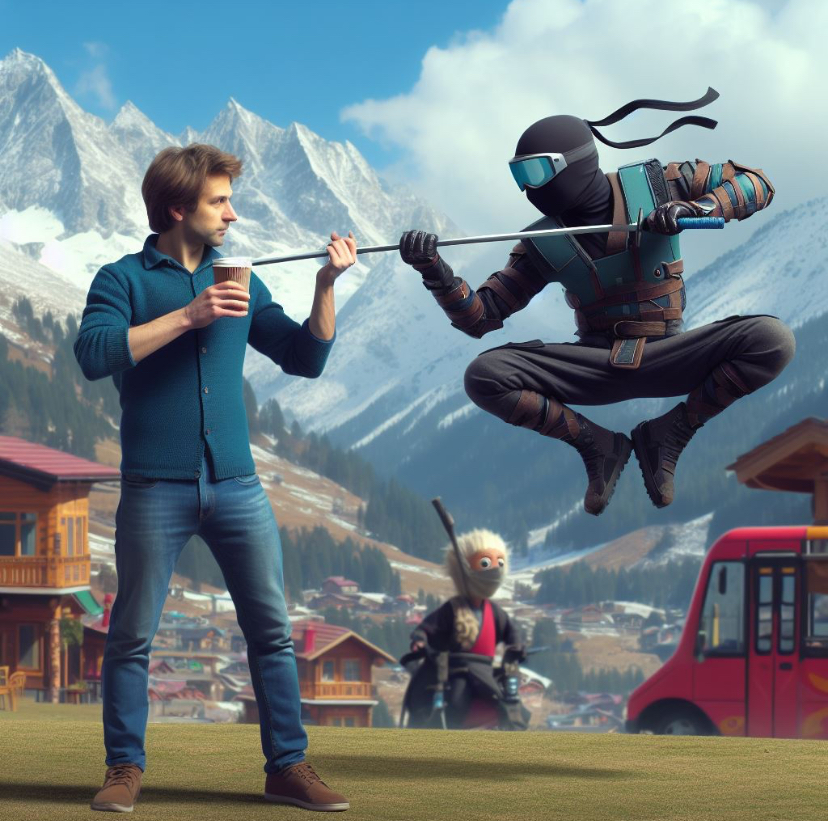 As I casually entered for my morning brew, wearing my camouflage pants for disguise, the door burst open, and in walked a menacing group of ninjas. The shop owner leaped over the counter, wielding a bag of coffee beans as his weapon. "Nobody messes with my customers' caffeine buzz!" he roared. I grabbed a bag of coffee filters and joined the fray, the patrons rallying behind us.