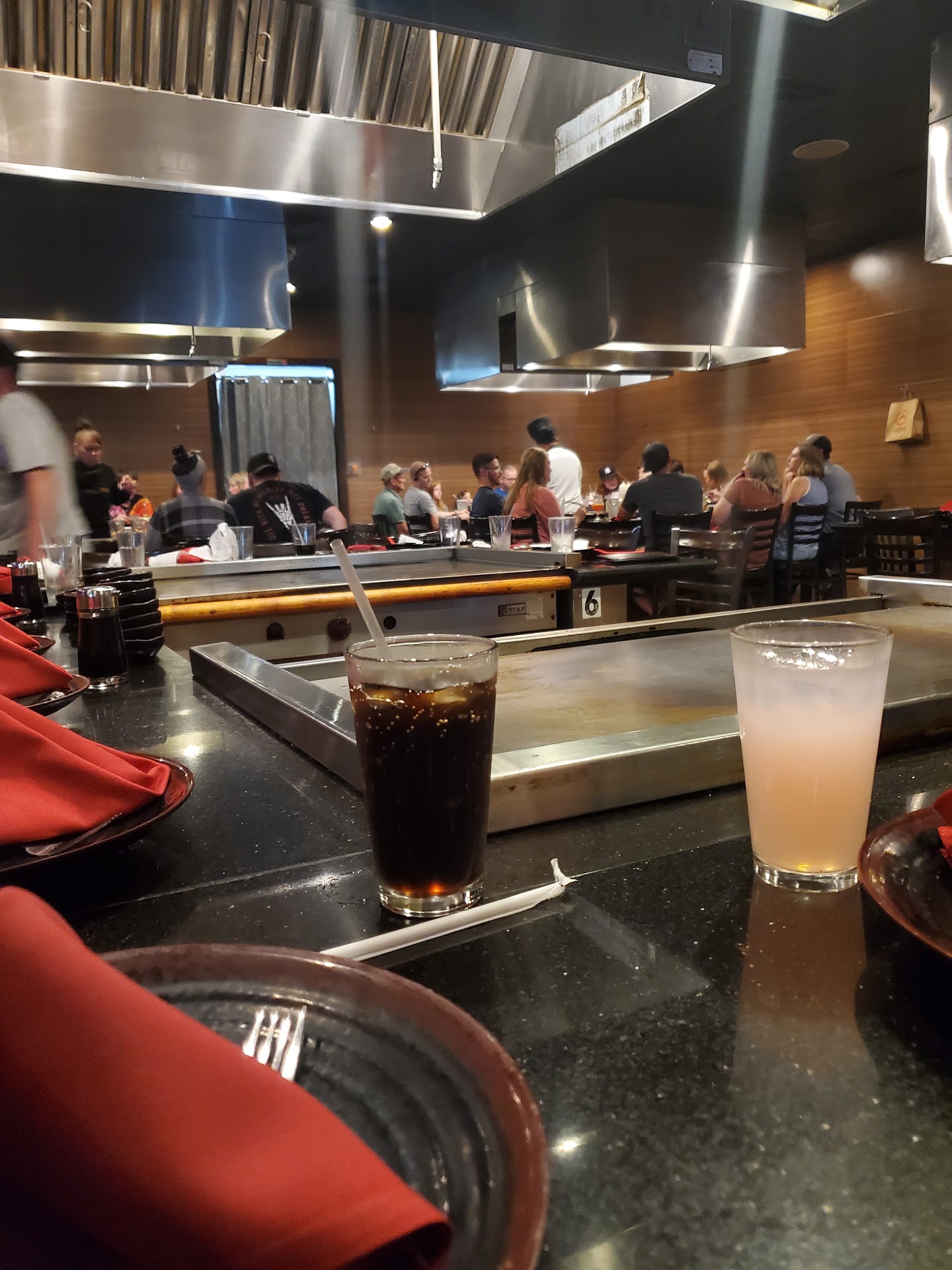My friend and I were cold and hungry from a mega Christmas shopping spree and although we did not want to stop shopping, we decided it's time. We wanted somewhere relatively quick but somewhat healthy....we decided to go to eat at Ichiban. The girls at the front desk greeted us immediately when we walked through the doors and just as quickly seated us at a grill that was already taking orders. Fortunately we knew what we wanted, I ordered the chicken grill and my friend the filet minion. We received a salad and soup and before I could get my chopsticks open, the chef was verifying our orders. We wanted a quick meal but this was almost too fast. The atmosphere was noisy and busy. There were people singing Happy Birthday while chefs were fire-cleaning their grills. The energy however was not annoying but rather perked us up and breathed a second wind into us. Our chef had a good set of showy tricks up his sleeve and effortlessly made the smoking volcano, tossed eggs up and caught them again with his spatula and tossed shrimp into his hat. He also tossed food bits at people to catch with their mouths when dinner was a little further along. The chef did a masterful job cooking each element of the dinner the way I like it and he even threw in 2 free shrimp for everyone. (Veggies were a little firm, chicken was cooked thoroughly but not tough and the rice was a little crispy). I would have liked more veggies but I always have that problem. We got exactly what we wanted but if you are not in a hurry to eat and you would like to relax and chat a little while you dine, this is probably not a good choice for you. I have eaten here before and my meat was cooked to shoe leather. I mention this in case you have a visit that does not turn out as well as ours did, give them a second chance.....everyone has an off day. One last little tip, if you go at lunch time, most all meals are between...