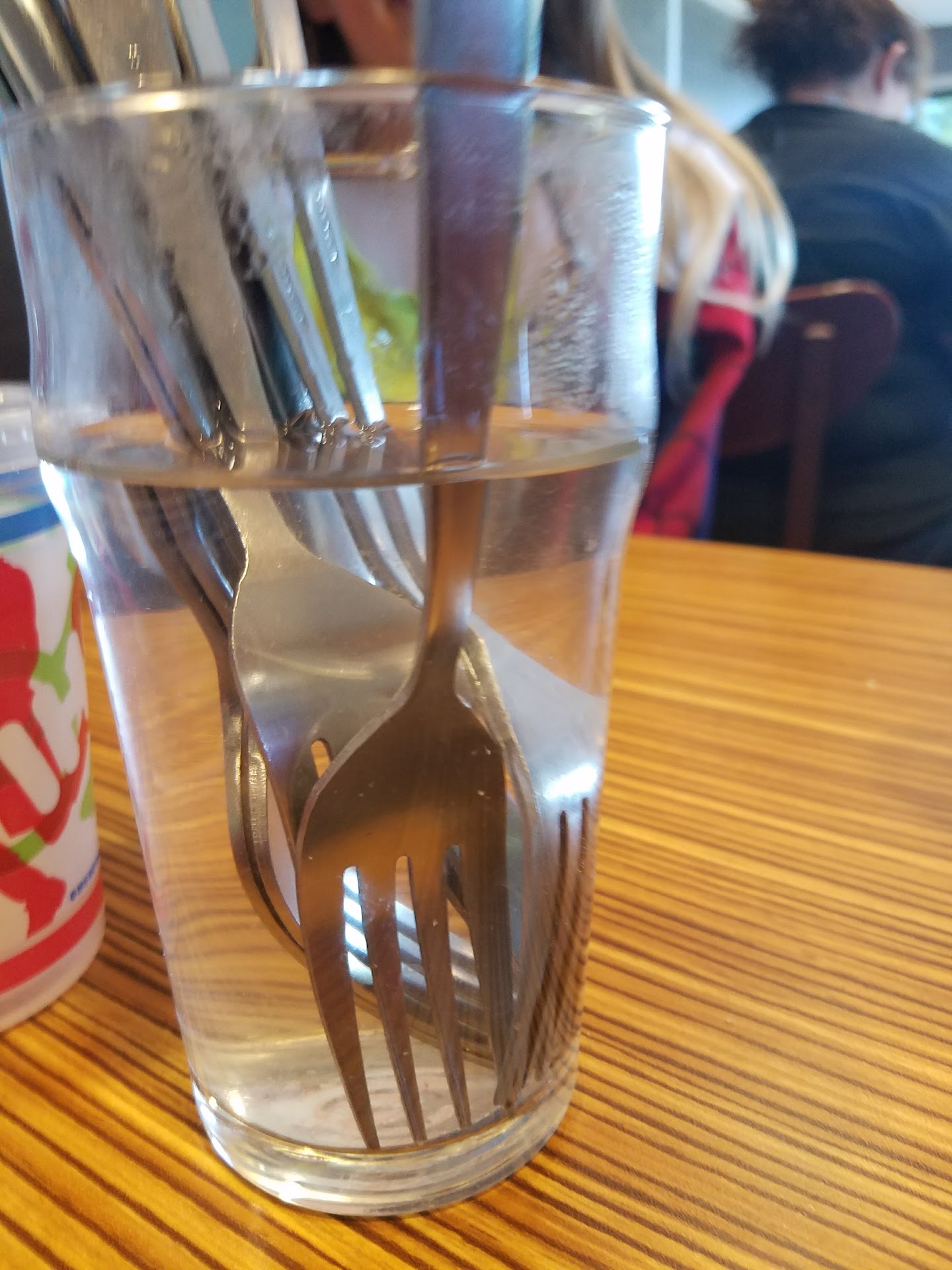 We were one of very few customers dining in. We ordered our food and waited about 45 minutes for it to arrive. DH was missing a fork, and had to wait a bit longer for cheeae sauce for his omlet and for his pancakes to arrive. My coffee was hot and my food came out fresh-ish (no real complaints here).