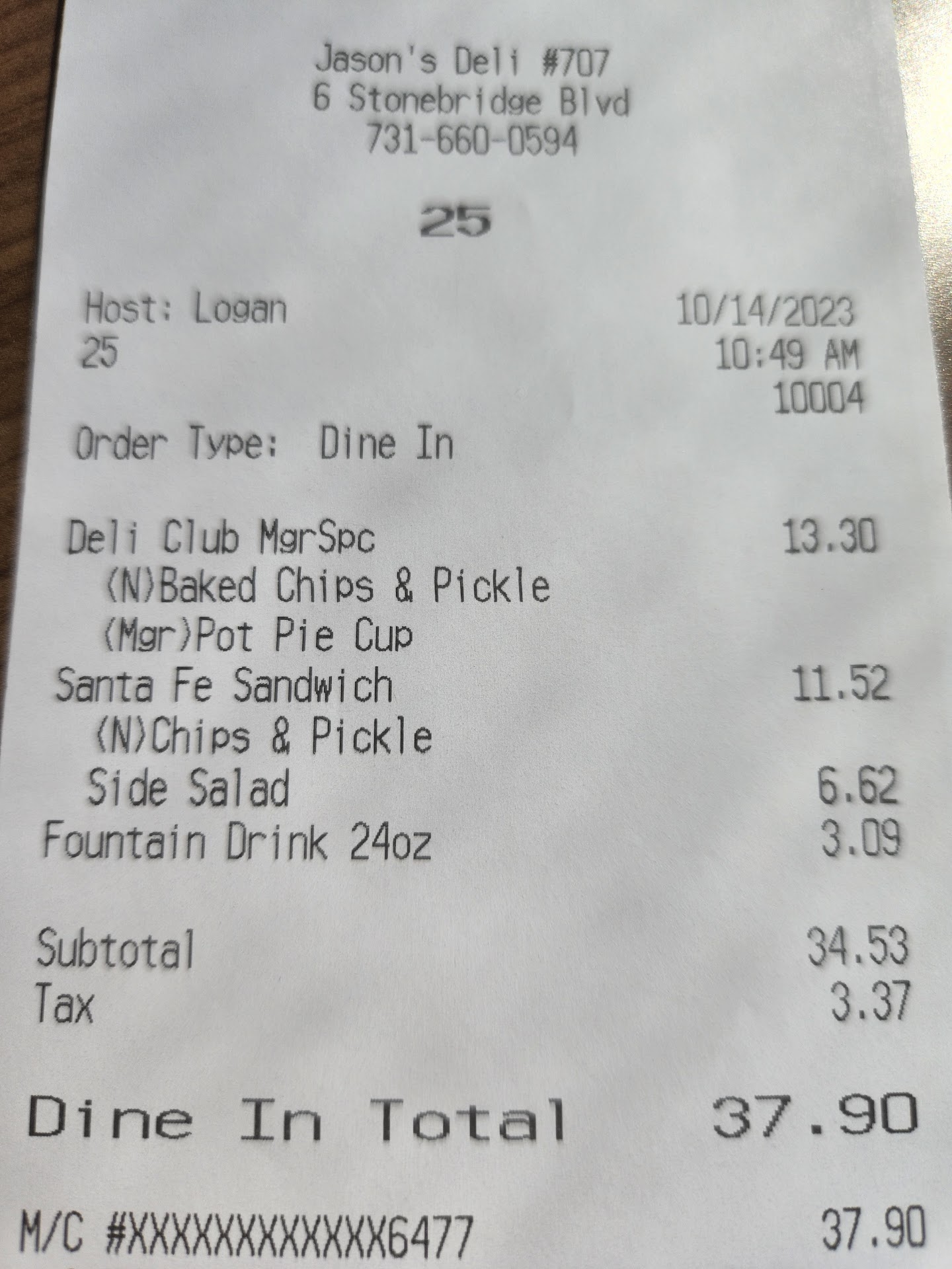 While I understand that 'costs' have increased, but this removes Jason's Deli from our places to go to for lunch (AND dinner!) ~$$$ for a sandwich + drink + side + tax .....! Yeouch! Nope. Just NOPE!