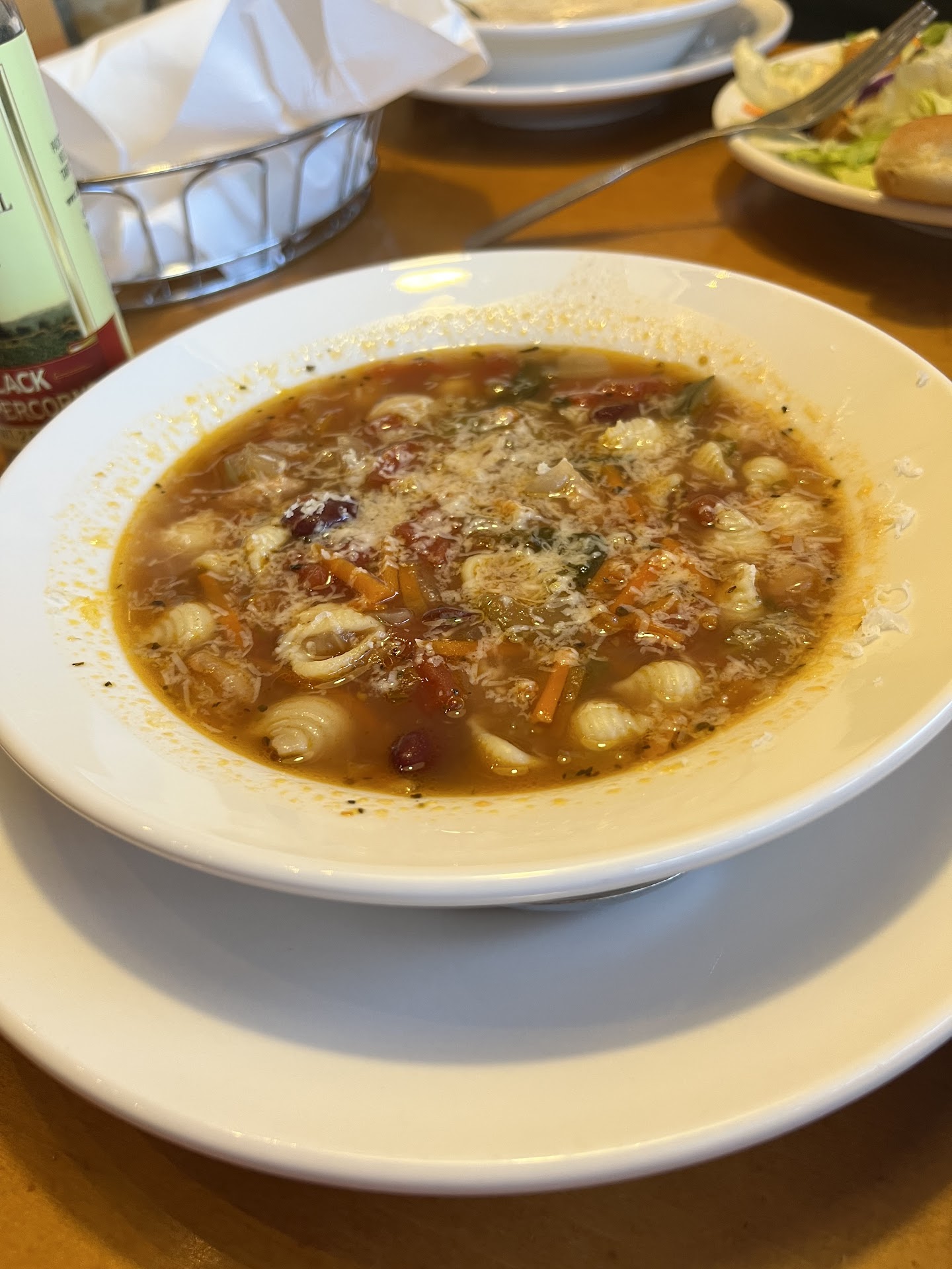 Our server told us she had only been there five days. She definitely needed more training. I ordered the soup, salad and bread sticks. My friend ordered shrimp scampi.