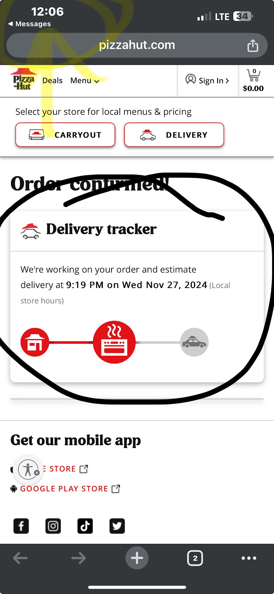 Read moreUPDATE: The pizza was left on my front porch at 1 pm the next day. Clearly a day old. Neither the store, nor Pizza Hut Corporate, will respond to me.