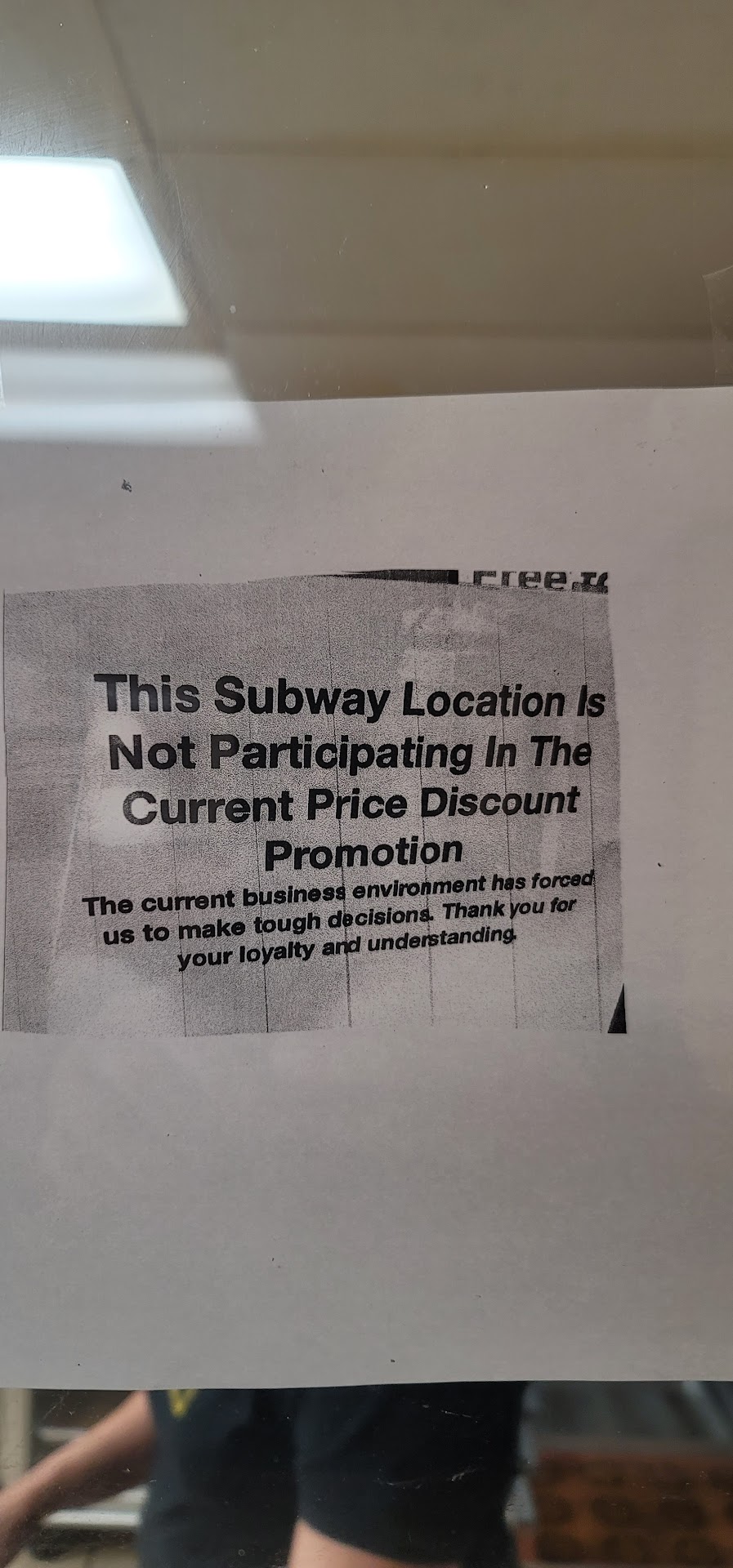 Read moreBe prepared for signs like this. This store is one of a few not accepting corporate sent coupons. If you do decide to eat at this location, be prepared to order very patiently because the lady (probably owner) acts as if she is not happy to make a sandwich for you. Also, they are very skimpy on the toppings for the sub. They definitely act very displeased if you ask for a little more on your sub- way to go with "have...
