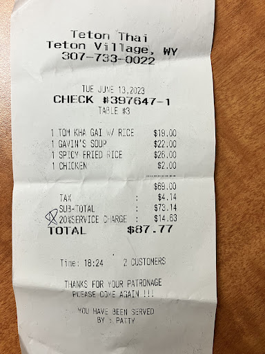 I think the restaurant must really want a limited amount of business because our $30pp + takeout order we spent two hours waiting for was treated like Teton Thai had done us a huge favor (I thought restaurants were in the business of feeding people?) with not one expression of appreciation for our business. During our two hour wait, my husband went to the hostess stand one time. He asked for a takeout order status update, and was told rudely, “it has not been two hours yet” to which my husband said, “it is okay that I asked, right?” We continued to wait another hour politely off to the side. When our takeout order was ready, we paid our bill and our takeout food order was held hostage. A manager came out and shouted at my husband for questioning what he was being asked to pay for a second 10% takeout service fee. The manager confrontationally shouted that he was most certainly charging us an additional 10% fee and we must hand back over our credit card again if we wanted to get our food. He said it was required because the “ five cooks in the kitchen had been working hard all night.” My husband was asking because we did nit receive any service. We were within feet of the hostess station and no one offered us a glass of water, asked how we were doing, thanked us for our patience and for choosing them for our family’s dinner, etc. . Despite the tasty overly priced food, we recommend that everyone stay clear of this restaurant. We will never spend another penny at Teton Thai and warn any future takeout customer especially if you are...