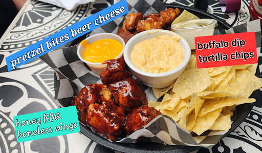 Read moreIt was raining the day I visited, so the outside option was a no-go.. Although it was a bit warm inside, the patio doors were open a bit, so it was comfortable enough, to say the least. Started off with the grilled shrimp and some fried mushrooms.. Nice size shrimp with tails on grill to perfection with the right amount of seasoning. Side of Caribbean Jerk for that taste bud kick start.. The fried mushrooms were sliced mushrooms, battered up,and deep fried to a crispy golden brown. Now for the wings. I went with 10 traditional wings. 5 were in Nashville Hot and 5 in dirty sauce. I believe it was called that.... yeah, I wish I would have had all in that sauce. It was some kind of boom boom sauce with the house twist.. It's definitely a good combination. Now chicken wings might be their specialty they have a menu full of other options... wraps, salads, and more. There's a full bar available. Although I'm not a drinker, there was a decent selection of adult beverages. Mixed drinks, beers, and IPA's. Great little spot to catch a game or a quick lunch break, So you can read my reviews and sit there wanting some good chicken wings and a few refreshing beverages, or you can go check it out...