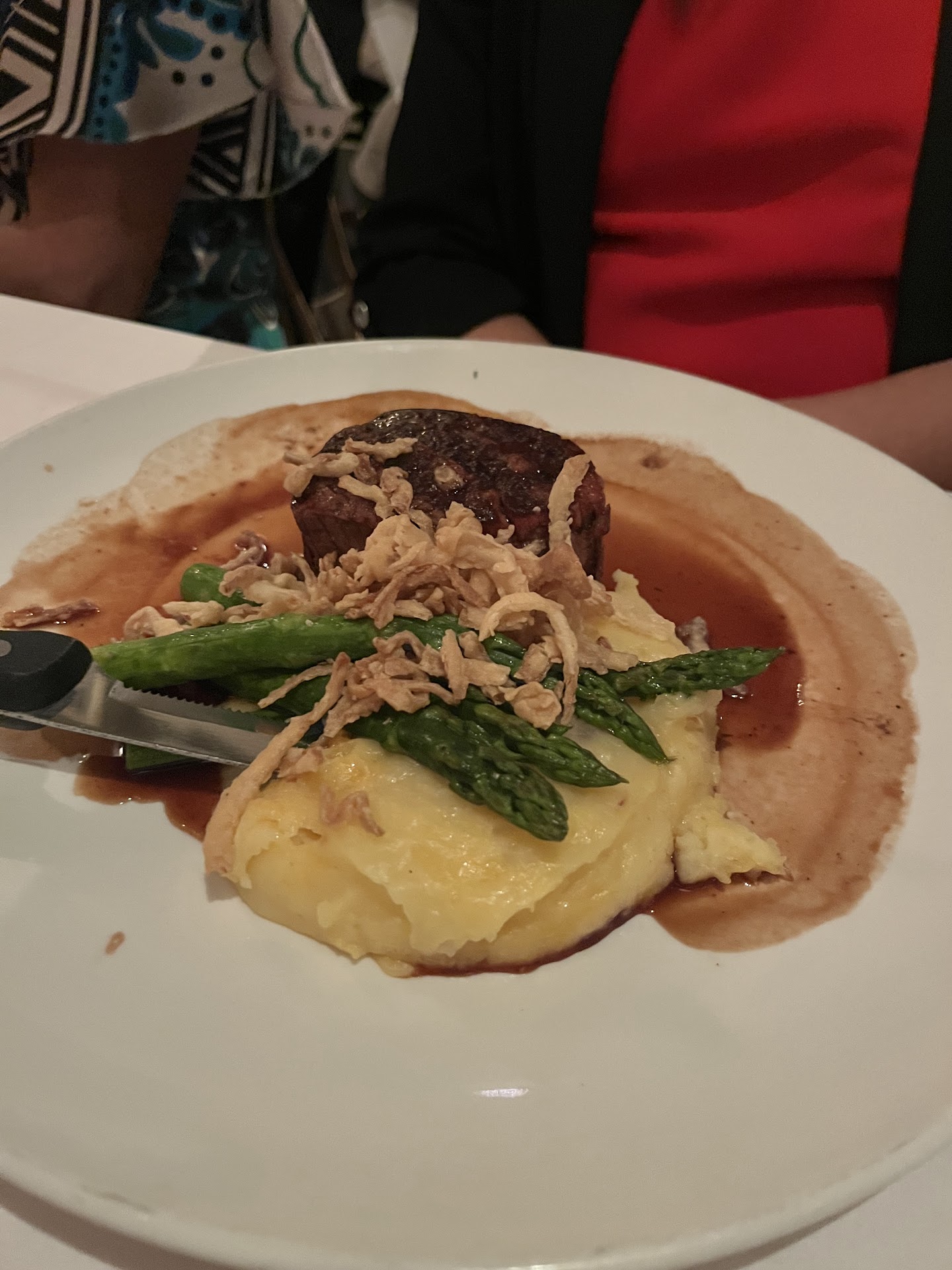 For my main course, I couldn't resist the Wood-Grilled Filet. It was cooked to perfection, tender and juicy with a smoky char that added depth to every bite. The accompanying truffle mashed potatoes and asparagus were the ideal companions, elevating the dish to a level of culinary excellence that I'll remember for a long time.
