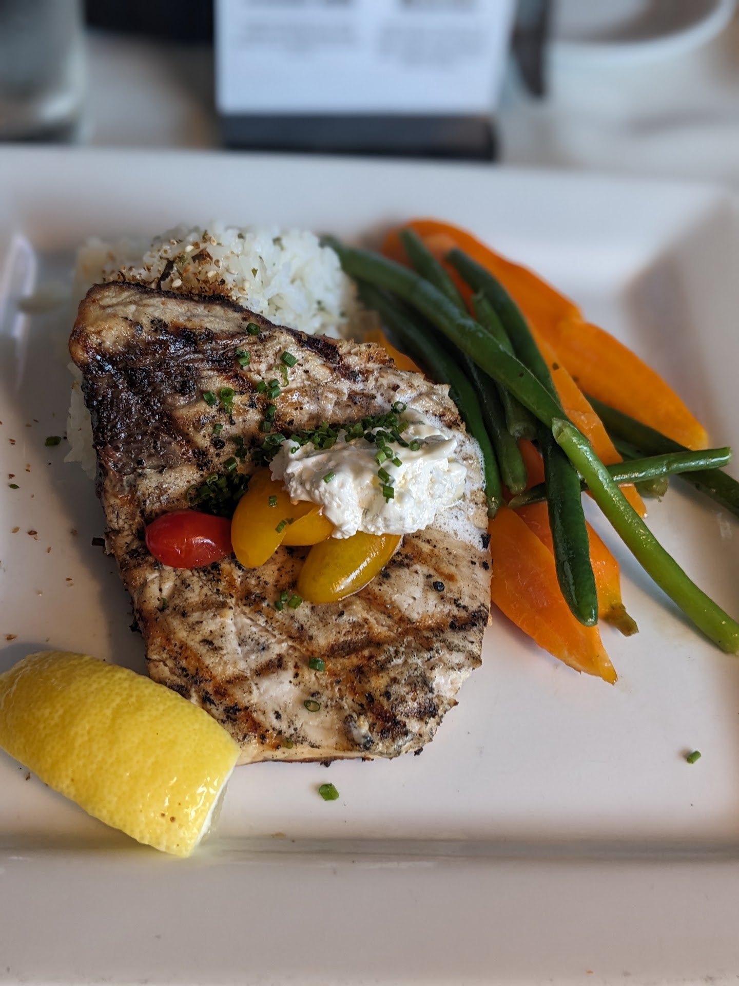 Again, I had the special - almond crusted Talipia with beurre Blanc sauce, mango rice and asparagus. Terrific. Husband had the ahi again. Why not? It was delicious.