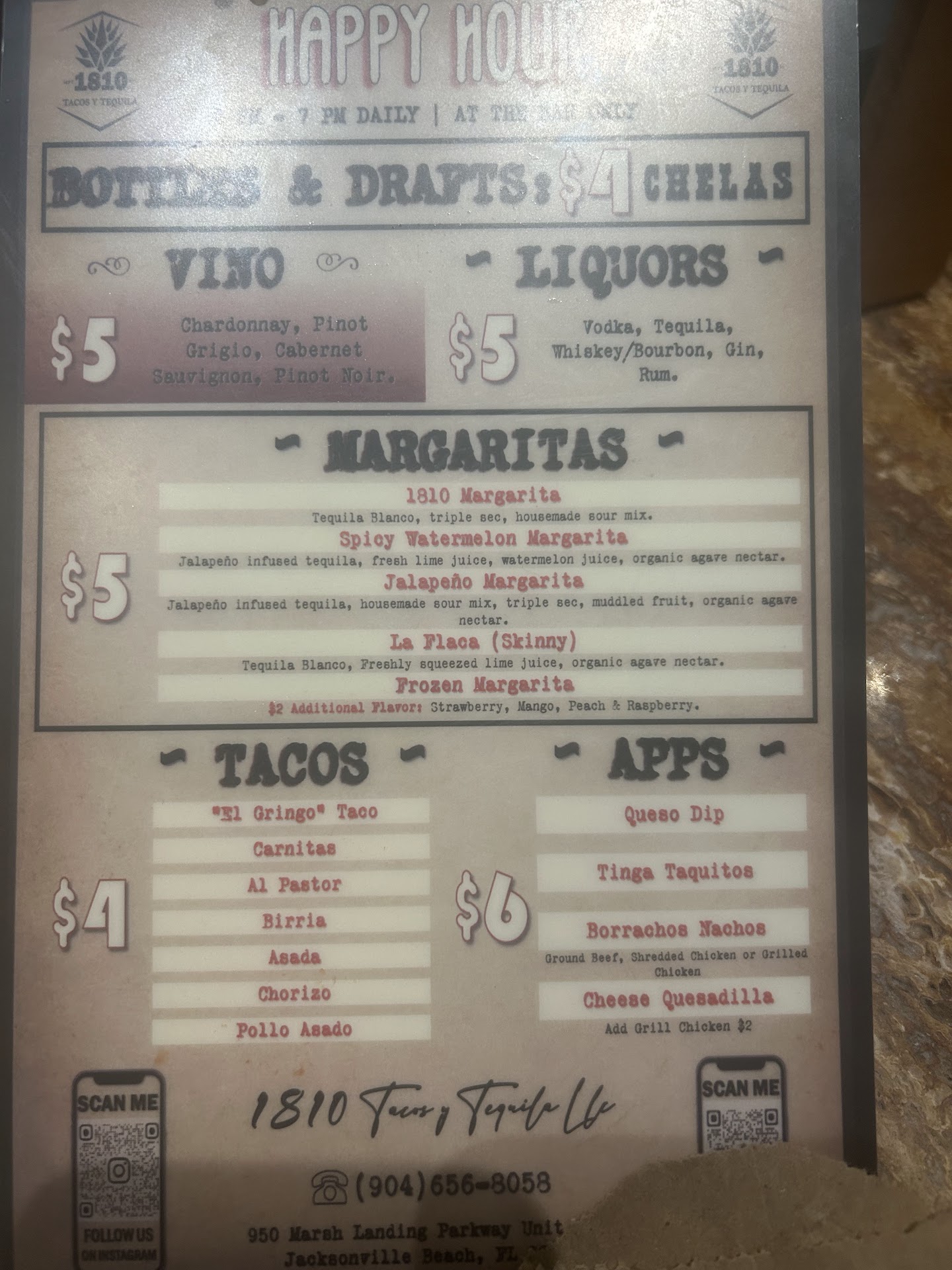 O.M.G. If I could give them 6 stars I would--no 10! Wait--11! Infinite stars!! Where to start: ok, we went for happy hour, had 5 different drinks between us, queso, the taquitos, and two tacos--the gringo with beef, and the asada (steak.) Besides only wracking up a bill under $50 (before tip,) everything was absolutely delicious. Like, amazing, can't wait to go back! Don't get me wrong, it's nice and casual, basic Mexican taco flavors, nothing fancy. But when the simple things are done perfectly there's something magical. I'm not ever big on steak, it's too chewy to me. The asada taco had the most tender steak I've ever ever tasted--filet minion level of tender--and nicely seasoned. The gringo taco, with beef, I would describe as classic taco bell for sober adults, lol. It was so real and complete, just really hit the spot. The queso was some of the best I've ever had. Salsa and chips were perfect. And the taquitos, which I expected to be finger food, were so flaky and full that eating them with a fork was a pleasure. Finally, the margs! I had the spicy watermelon first, very nice, will balanced. Second the jalapeño, a bit sweeter, also very good. Last, the skinny marg, I really liked it, less sweet and more sour in comparison. My bf had the house marg, which we both liked, and second a house gin and tonic. I'm picky about tonic and find fewer and fewer places with, frankly, drinkable tonic, and this was prefect. From the gun, not a bottle, but really good flavor.