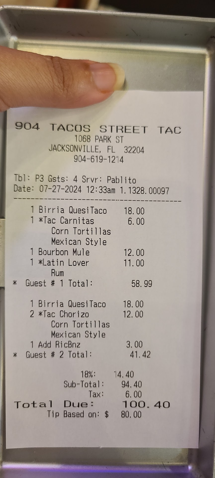 Read moreWanted to share our experience on a group outting. We had just started a bar hopping event with some friends and 904 taco was our first stop. Everything was fine, chips, salsa, one round of margaritas and two appetizers and we were ready to move onto the next location. The bill arrived. We asked if there was any issue in splitting amongst multiple forms of payment and the waiter kindly said no problem. We proceeded to put down $40 in cash and three credit cards for a $75 check. We instructed the server to deduct the cash and then split the rest amongst the cards. The waiter came back and kept our cash and split the bill amongst all three cards, evenly! Gratuity was included in the original bill. They took our cash, then proceeded to add gratuity onto the split bills. I went to ask for the original bill and let the waiter know that he had not followed our instructions He proceeded to have a conversation with a cashier in Spanish in front of me, which luckily I understood, refused to give us the receipt and refused to bring the manager so we could settle this blatant theft and over charging. Please be aware that 904 taco hires thieves. Watch your bills, protect your dollars, 904 will take your money and then act dumb when you call them out. It wasn’t a language barrier it was a blatant refusal to be transparent an obvious ploy to pilfer dollars. We wound up, leaving in order to not cause a scene, but in all we spent as much on the pilfered gratuity as we did on the check. This happened 03/28/24 at 6:42pm, our servers name was Pablito. I really hope management see this and makes the necessary changes so that future customers do not get robbed...