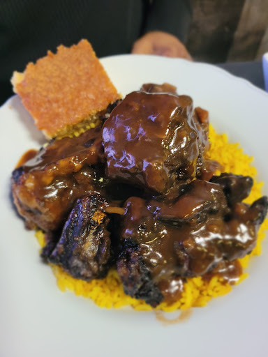 Let’s talk about my husband’s order first: Oxtails. Now, these aren’t even on the Saturday menu, but Jacob, our waiter (and now honorary family member), worked his magic and made it happen. If that’s not next-level customer service, I don’t know what is. He paired those oxtails with collard greens and sweet potatoes, and trust me, they were so good they practically demanded a standing ovation.