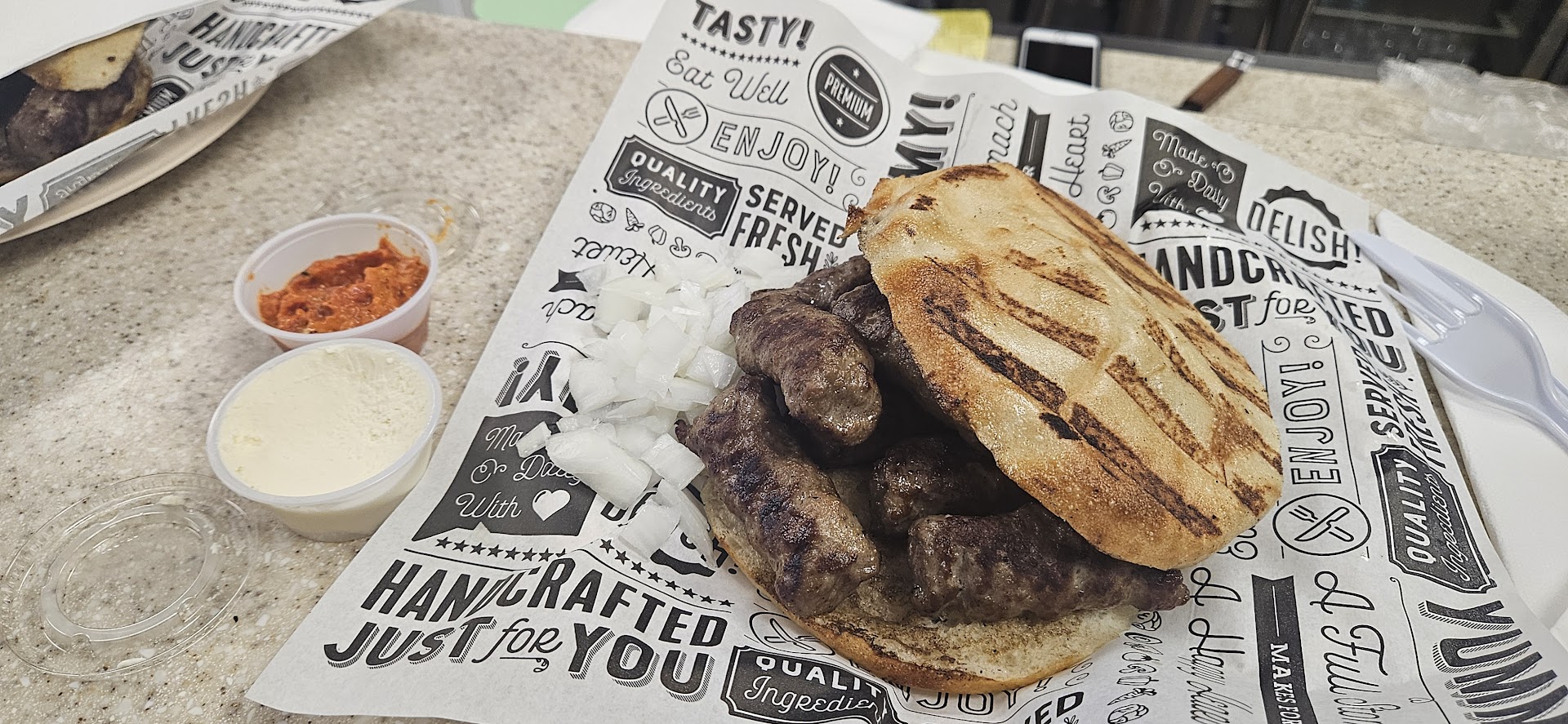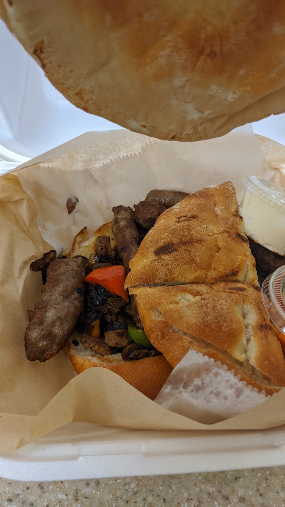 We walked in, grabbed a table, and within a few minutes the owner came over to talk to us. He explained each to the different meat options to us, along with a recommendation, and told us he would give us free dipping sauces since it was our first time there. I can’t even possible do the food justice by trying to explain it; but essentially it was three different kinds of beef in-between to thick, warm pitas (almost like a sandwich, but there is no way you could have picked this thing up).