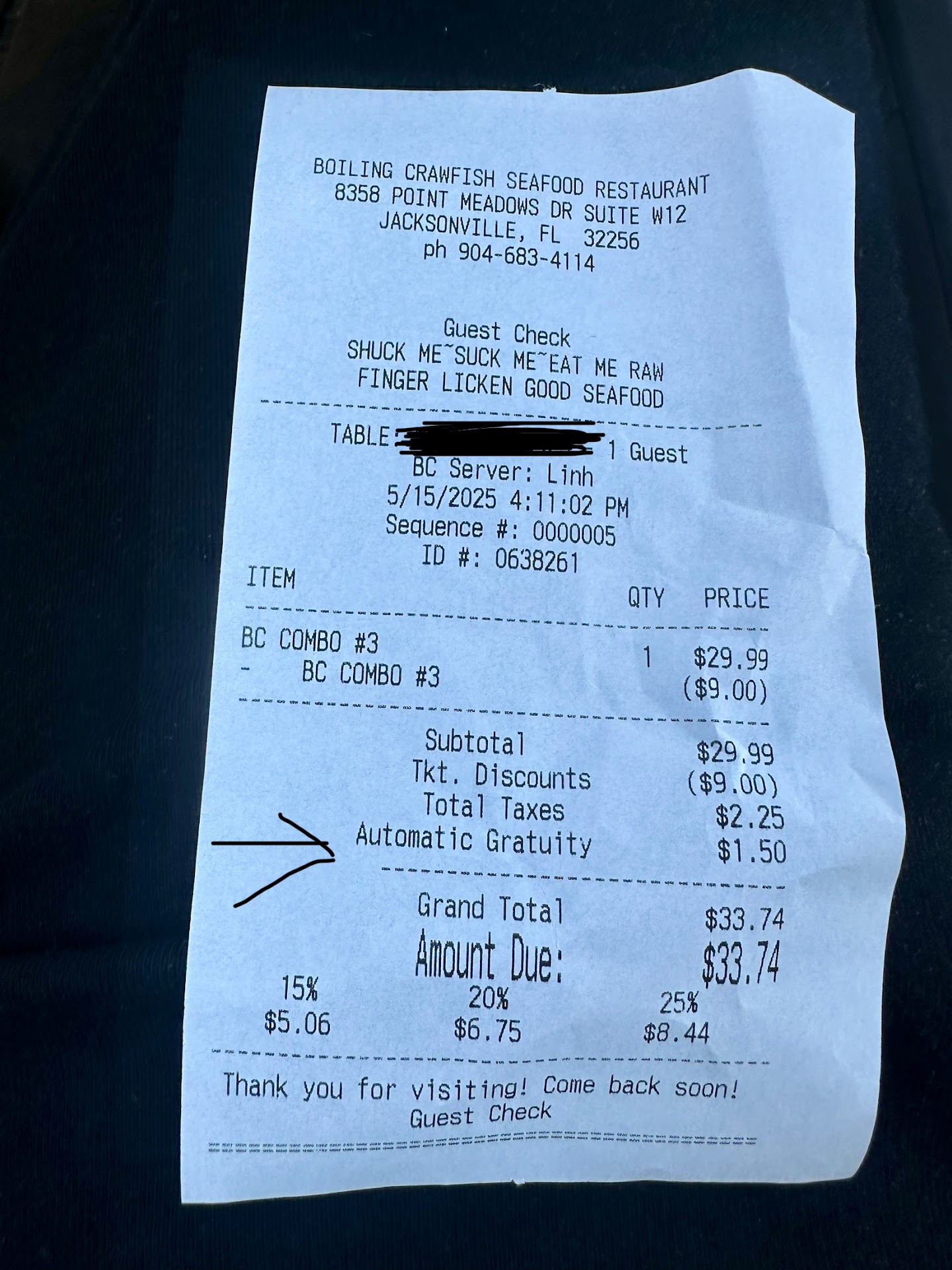 Ā Ā Ā Read moreMy family and I have patronized this establishment every since relocating to Jacksononvile. Most of the time our orders are prepared properly. But for some reason the last few visits have been sub par. Today was one of the worst experiences that we have encountered while dining out. The waitress was extremely non attentive. She came to the table and took our order, each of the three orders requested that they exclude the sausage as we all chose the Tuesday Snow Crab special. I asked for an additional order of eggs to go along with my order. When our food arrived I opened my bag and noticed that there were extra sausages in my order, no potatoes, and no extra corn as I requested. I called the waitress to the table and asked her to correct my order. She informed my that she would take the extra sausages off of my order. As time went on I noticed that she wa me waiting on other customers and was not attempting to bringing me the potatoās that were missing from my order. We then called her to the table and asked for our checks so that we could pay and leave the establishment. After receiving the bill I noticed that we had been charged a service fee of $6 in addition to the $64 bill. Feeling that waitresses should be compensated tips based on their customer service, I asked the waitress to remove the device charge because she failed to complete my order and that I felt as if her terrible service didnāt not deserve a tip. She then proceeded to ask the manager to remove the service fee. After returning to our table she stated that the manager refused to remove the service fee for the food and that this could not be done. I told her that I was not paying for the service charge and she then went and got the manager. I then went on to explain to the manager that I did not receive my items that I ordered and that after telling the waitress my order was incorrect on several occasions she didnāt do anything to correct my order. I then went on to explain that on several occasions I was being waiting on by our usual waitress Kayla, Who by the way always provide do EXEMPLIARY customer service, I asked that the service fee be removed so that I could tip her, and her alone 20%. Because she explained to me that she has to share a portion of the service fee with other workers at the restaurant. The manager then went in to say that this was their policy and that it could not be altered. I then told him that he he was not telling the truth and that on several occasions Kayla had taken the charges off of my ticket. As I do not believe in tipping others funds that they donāt deserve nor do I think it is fair for an establishment to require their waitresses to share their wages with the other workers. I feel as if this is dishonesty at its best. I then told him to go ahead do what he had to do and that I would follow up with a review of their establishment, and forward my complaints to the BBB, FTC, CFPA, and file a complaint with the Labor Board. After completing the transaction I took the paperwork and left the establishment. My family and friends will not be supporting this establishment anymore. We have spent thousands of dollars patronizing them since the few months that we have been on this city. Itās shameful that this issue couldnāt be amicably resolved while I was at...