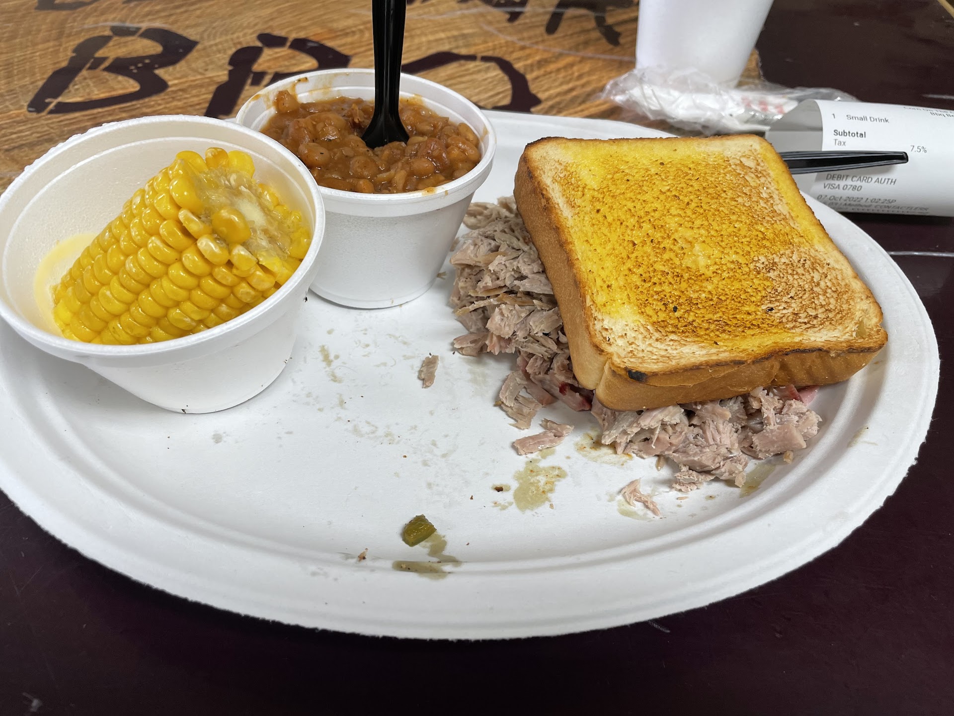 —food: -I ordered a lunch portion (pulled pork) and a small drink ($2.99 for a small drink) -no 2 meat option. -pork flavor was bland. -served with plastic forks/knifes.