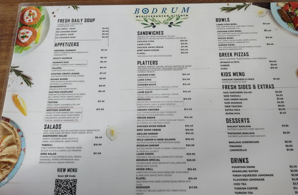 Read moreDecided to go for Mother’s Day. Was seated right away. Place is very small. It had a very odd smell as we entered. Complimentary champagne for Mom, which I loved! Ordered the sampler to start which was simply AMAZING. Nothing to complain about. My kids read “pizza” on the menu. It wasn’t good at all, but, the waiter took it back and didn’t charge us for it. The lentil soup was offered with and before my dish. It was GOOD. Could’ve had more flavor/seasoning, really good. I ordered the “sautéed beef.” It was ground beef, and stewed. Not pieces of beef, like I would imagine. Aside from the description being misleading, it was SO good! The reason for the 4 star, instead of the 5. As we sat and waited for our Turkish coffees at the end of our courses, one of the waiters cleaned a table, and sprayed a bottle filled with “purple” stuff, in which we all know is Fabuloso. It made us want to VOMIT. Why would ANY restaurant spray a scented chemical in a food setting? It’s was absolutely awful and we couldn’t wait to LEAVE. Please, Bodrum, stop spraying the purple stuff to wipe down your tables while people are eating!! Simple peroxide or a mild soap and water will do JUST FINE. We won’t be returning, just because of that. It ruined the...