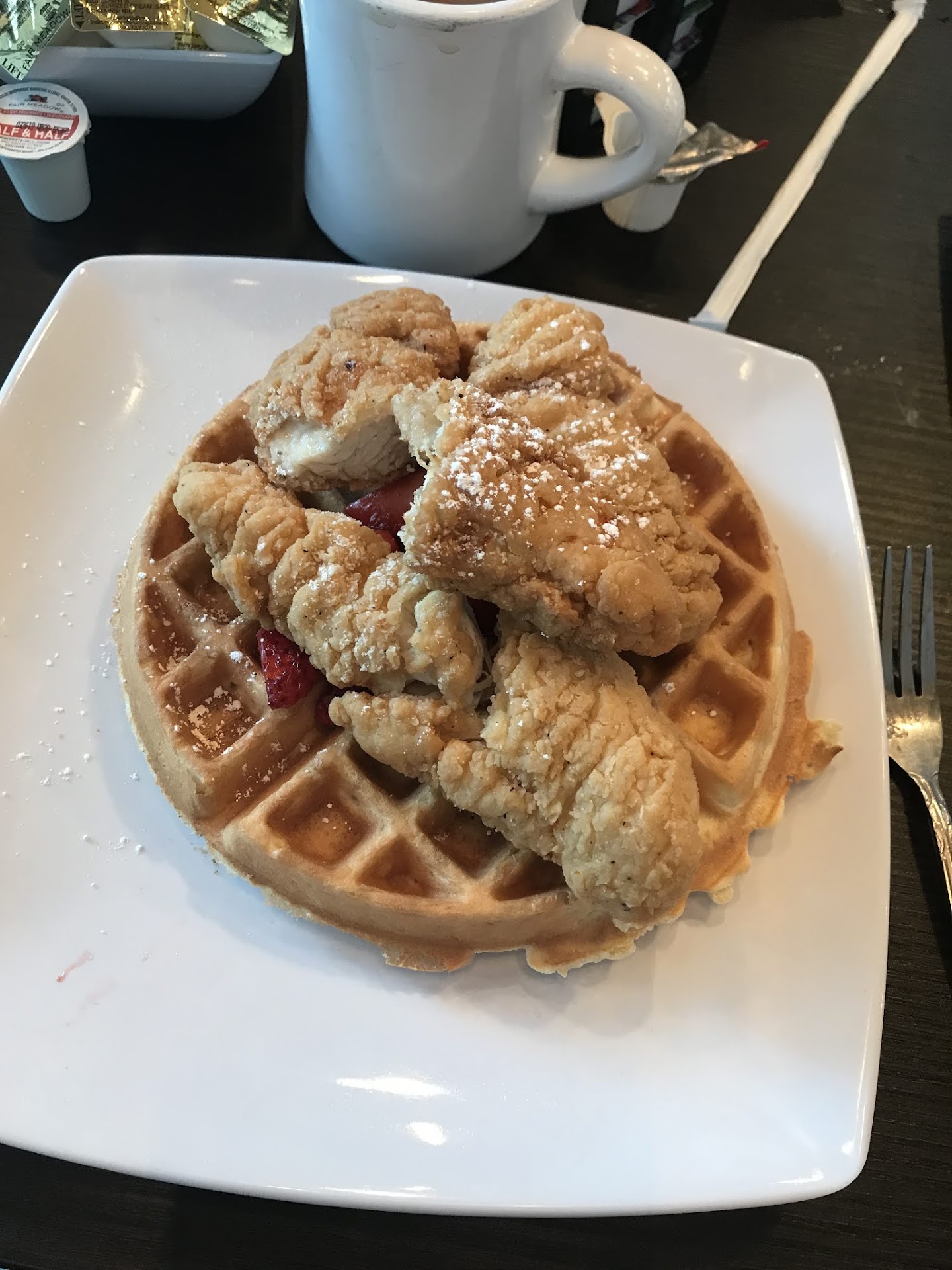 Read moreI was really excited to try this place because Nate Does Food reviewed them and gave them the thumbs up. Right off the bat we were already disappointed. We were seated and waited quite awhile to be approached by our server. Once she did finally make it to our table she did not greet us with a good morning or a how are you, she just said, "What do you want to drink?" After she took our drink order, we said thank you, and instead of saying you're welcome or even just giving us a smile, she walked away. Her attitude never changed during our visit. As we waited what seemed like forever for our food, we noticed multiple tables sending food back or complaining about the service. The table next to us had egg shells in her eggs and the other table next to us waited 10 minutes for silverware after they had already gotten their food. My husband ordered the Big Daddy Omelette and I ordered the Chicken and Waffles. The food was mediocre and extremely bland. My waffles and his grits had zero flavor. We had to ask twice about his side of gravy and he was missing home fries inside his omelette. I asked for a side of strawberries, which was $1, and I got, what looked like, two strawberries cut up into small pieces. The coffee was terrible and they only had vanilla coffee creamer, no regular. We were never asked how our food was or if we needed anything else. When we left, we were never greeted out the door. I was super disappointed and will never be back. There are so many other places to have an amazing, friendly brunch in...