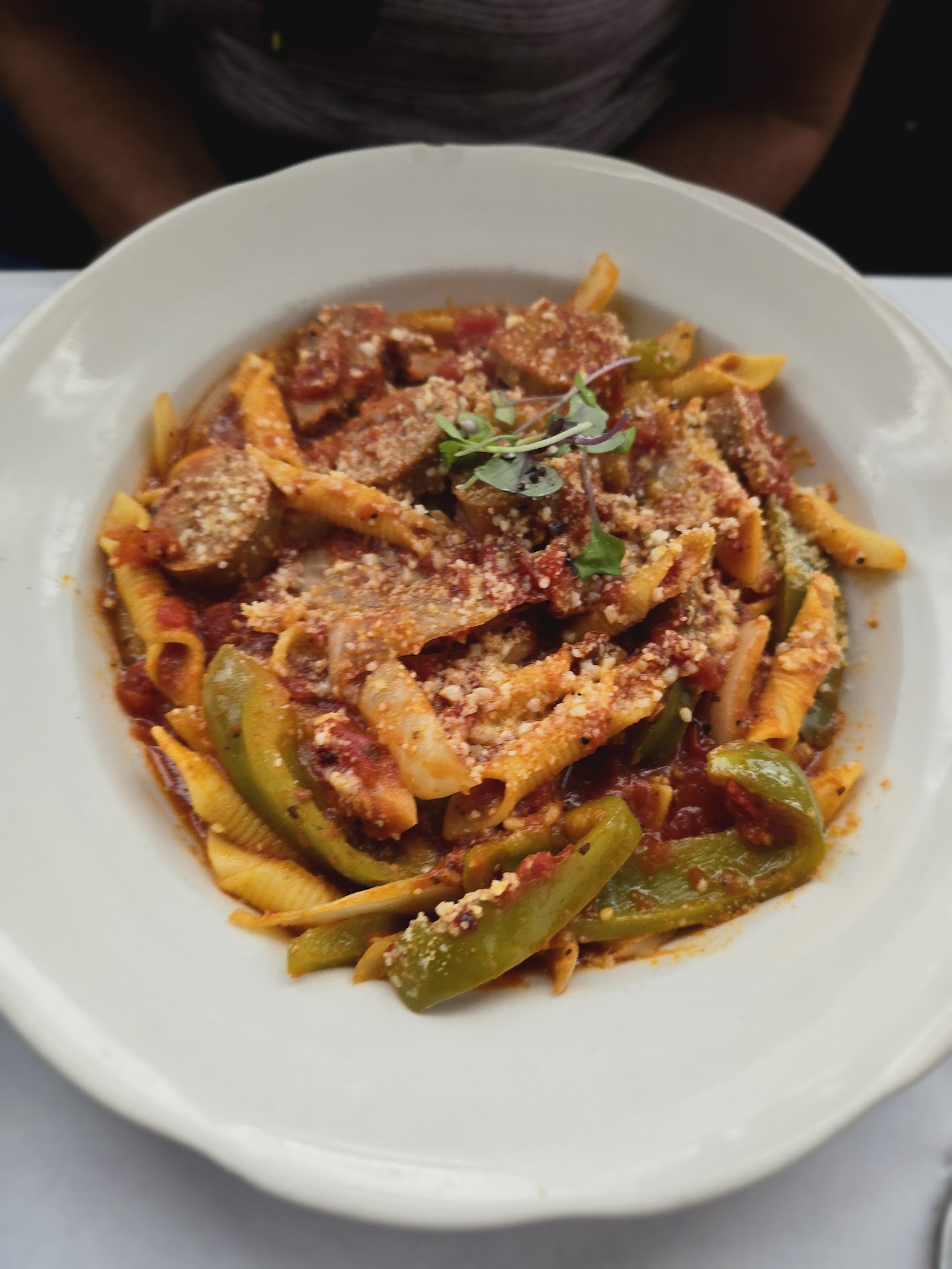 Sausage and Peppers. . . Sliced Catullo's Italian sausage, made locally by The Swinerie, sauteed together with green bell peppers, onions and marinara, then beautifully married with fresh egg garganelli pasta. If you like heat, ask your server to " Fra" it out! 21.9