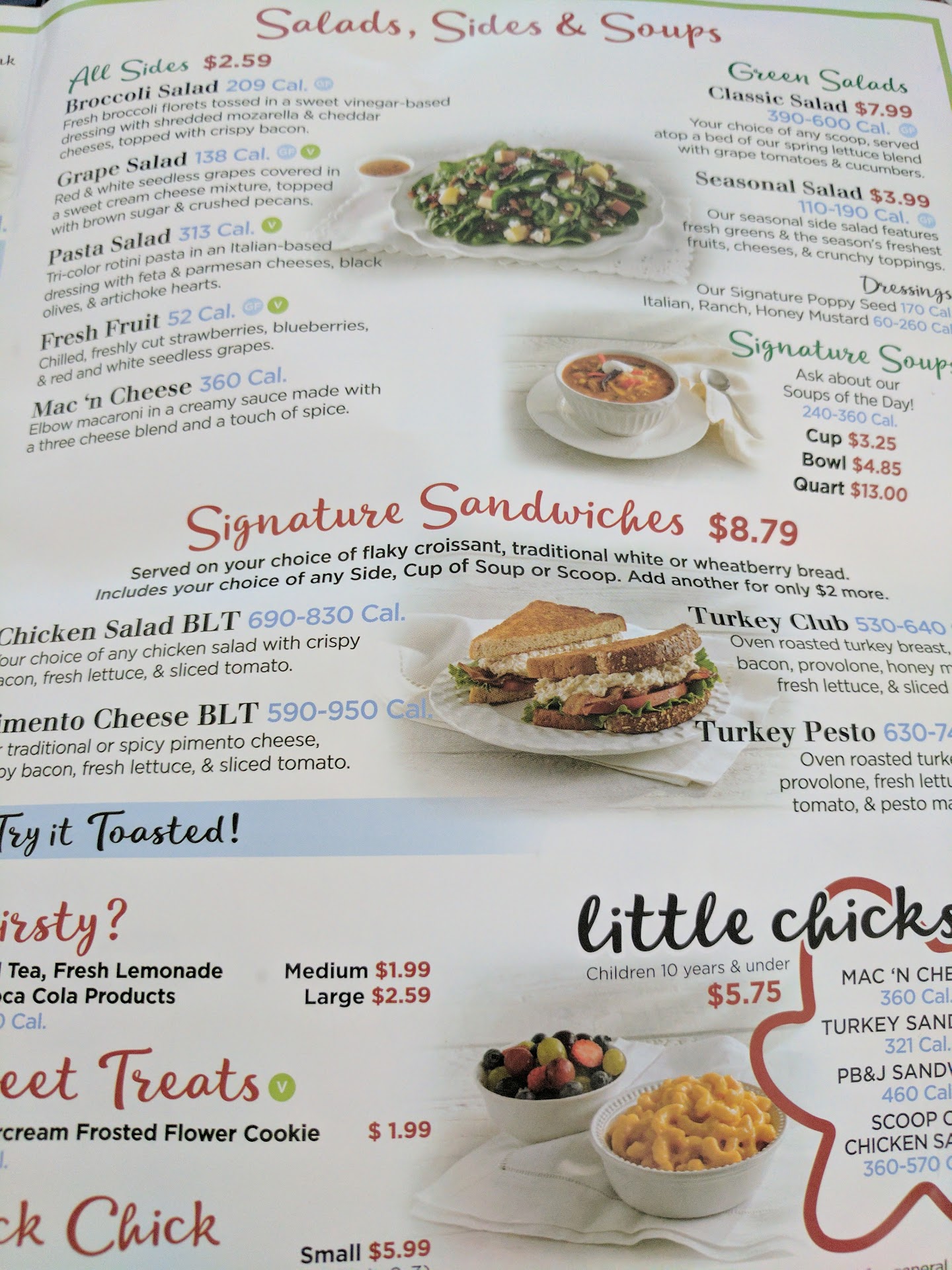 Read moreWe visited the Town Center location on Sat, July 26th. To say it was crowded and busy is an understatement. We walked in to very few tables being avail and a decent line of people waiting to order. The woman behind the counter taking our order was not polite (not rude either but seemed very flustered and "over it"). She took our order, informed me that one of the chicken salad scoops I ordered was not avail so I had to choose another (Barbie-Q was the one they were out of). She also stated they were out of tea and lemonade. This was disappointing but we made other food and drink selections. We found a table to sit at (it was dirty - receipt left on table, trash on table, clearly not wiped down, etc). We did not see a single employee wiping down tables during our visit. No one came to the table to ask how our food was - which they normally do. Our food was delivered (by the same woman that took our order) and she was a bit friendlier this time around. We did notice that single pack of crackers that were given to us were broken. This didn't bother us at all but it's rather difficult to eat with broken crackers. We normally love this location and never have an issue, but this last visit was...