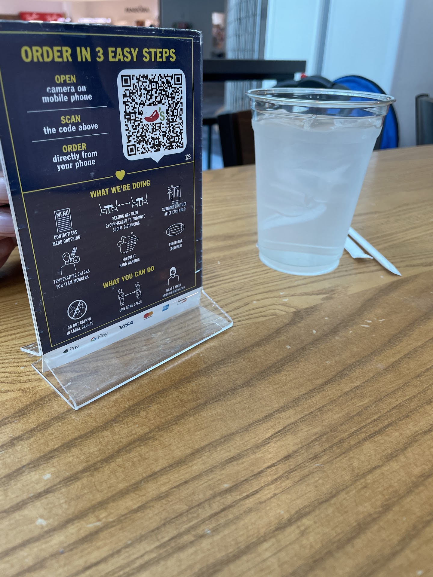 •The menu is severely limited and despite actually advertising Chips & Salsa (arguably Chili's signature appetizer) there are none here. Not an option. Just weird.