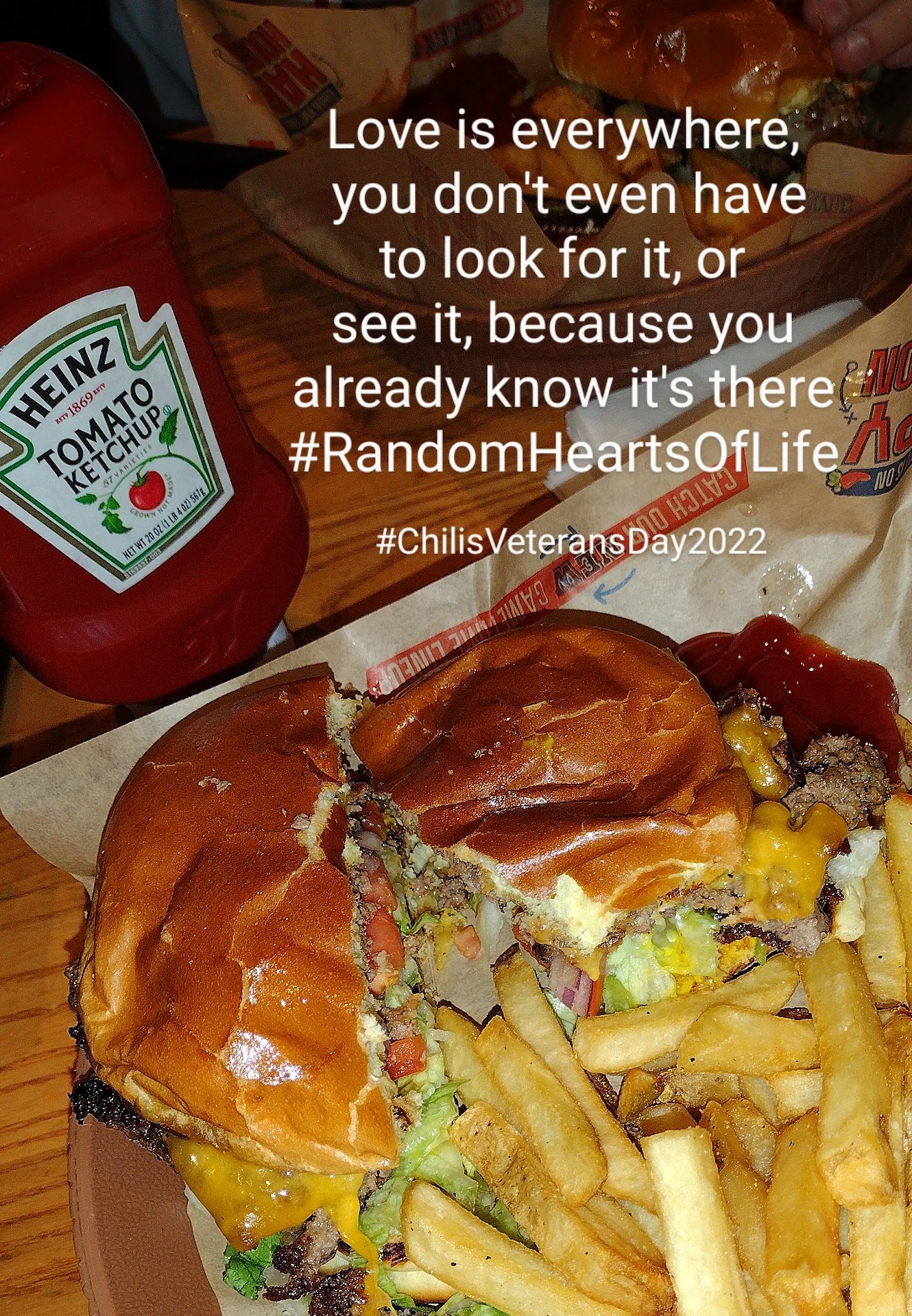 As a creative director, I tend to visually observe everything going on around me, and if I missed something a picture tends to share details of those certain moments to keep me reminded of the greatest parts in life. #RandomHeartsOfLife is a collection of my photos that have random hearts in them. The picture below shares that heart on my dad's burger bun, which is a great symbol to represent our moment together this afternoon. My dad's love of his family, me, food, community, country, and life in general was shared back to him as his meal was complimentary showing and sharing appreciation and gratitude by Chili's with their Veteran's Day Menu Special.