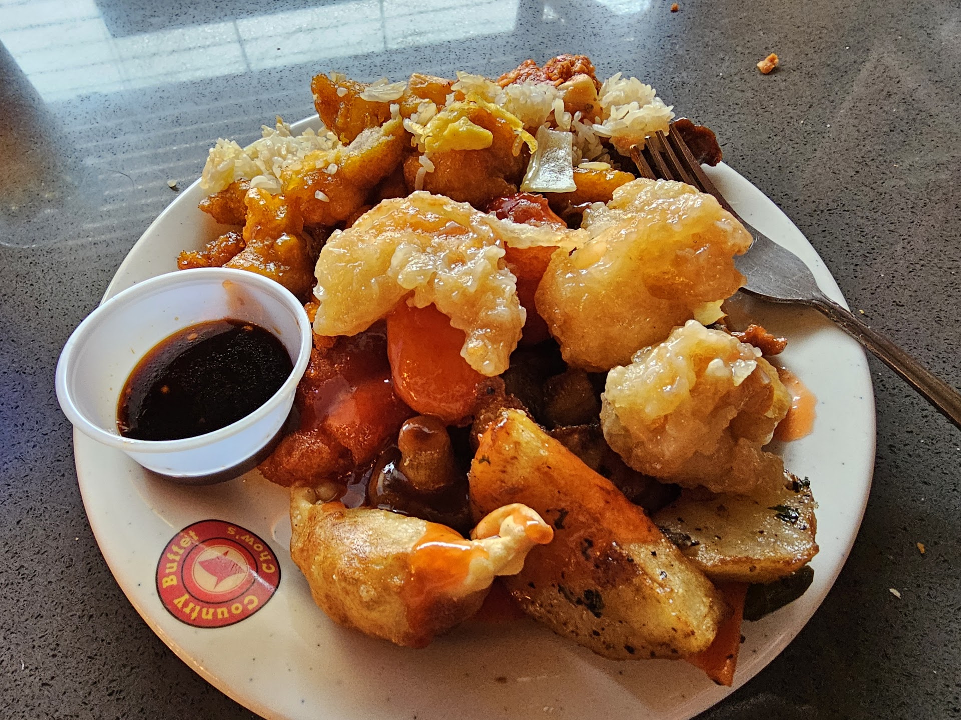I can’t remember everything we tried but a few bland but not totally inedible things were: Green beans, Mac & cheese. Absolute low points: The watery sweet potatoes that tasted like a Disney boat ride and the “baked lemon chicken” that tasted like low tide and metal. It was also somehow grotesquely fishy, I had to spit it out. I suspect they don’t wash the pans and someone piled chicken in a fish tray. Nothing else had any discernible flavor and the meats had random gristle and rubbery bits inside which made every bite a game of roulette.