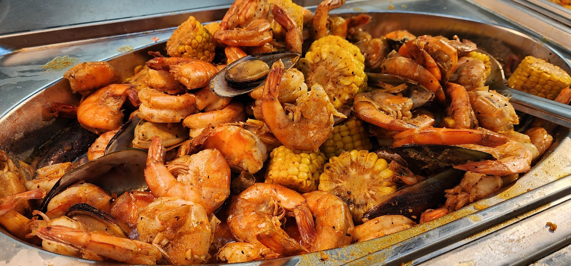 The place has the ambiance of a school cafeteria and even though it was busy it was weirdly quiet. No laughing or lively conversation. No one was having fun. Just a lot of people very intensely eating unseasoned food and watching for the shrimp to get refilled. The place is not clean. It looks like it used to be clean and maintained but all that work is actively being run into the ground. You can see the grime building in the corners and up high and on the glass. Anything that would take an ounce of effort to reach is being ignored. You have to get a plate for yourself by bending and reaching into a bin so you get a plate covered in human dander. Everyone’s hands go into the utensils, too.