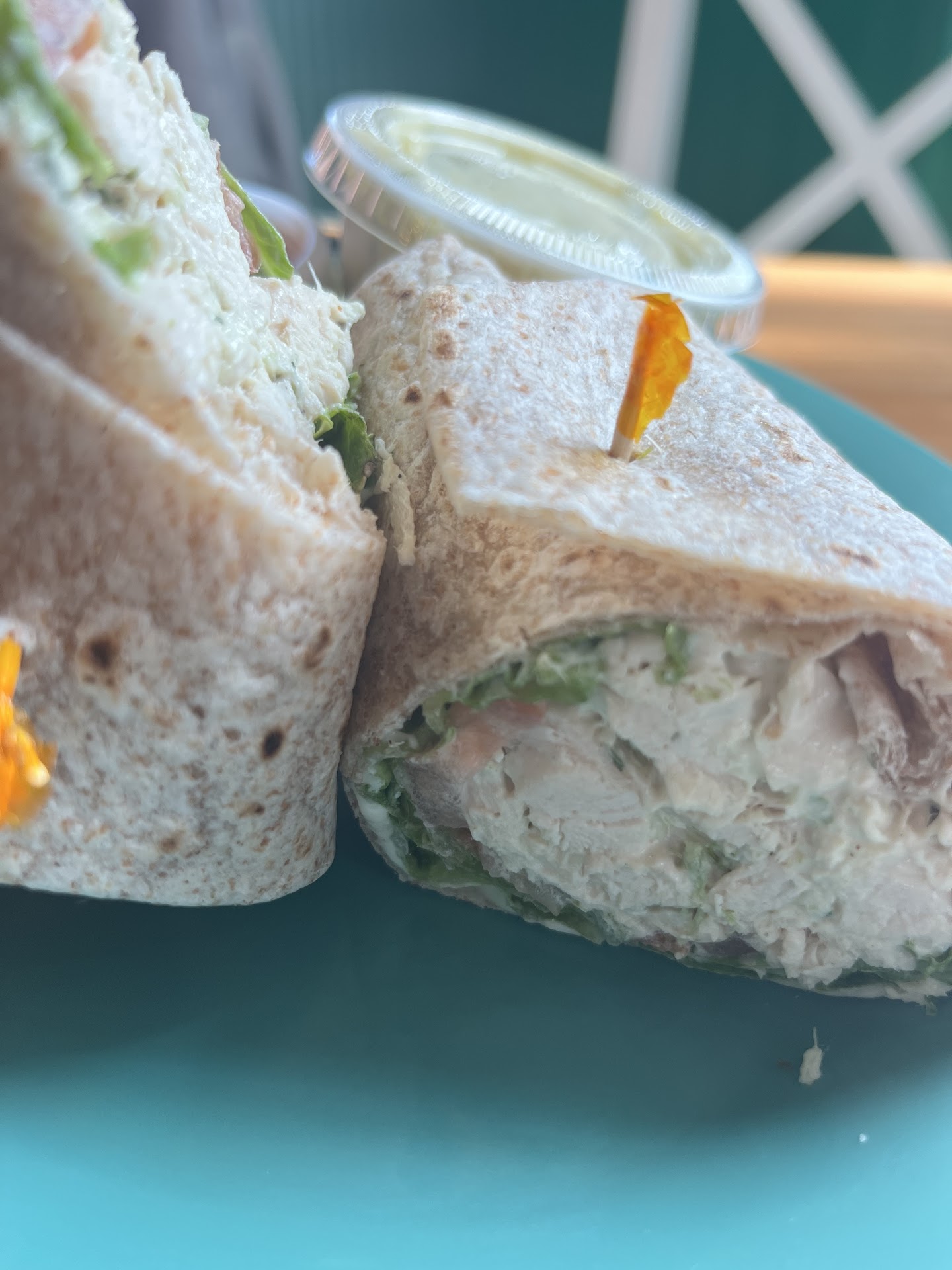 My go to is always Chicken and fruit. A healthy scoop of chicken salad, surrounded by cantaloupe, melon, grapes and more. Sides are not an option and believe me, you don’t need it with the mammoth sized portion of this salad.