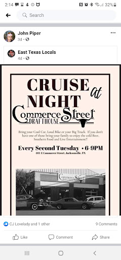 My wife and I happened to be in Jacksonville Texas this past weekend. We are from the Dallas area, so we wanted to find someplace to have lunch before our return trip home. This little gem of a restaurant is tucked away near a bridge. I am sure the locals know of the Commerce Street Drafthouse, so we were Pleasantly surprised when we decided to stop by and have lunch there. When we entered the restaurant, we were immediately greeted with a smile and warm welcomes. The tables reminded me of sitting down at home which was a pleasant experience compared to most restaurants. The restaurant was clean and had character. The atmosphere was Laid back and not rushed. Our waitress stopped by and collected our drink orders and actually chatted with us and gave us her full attention and did not rush off as soon as we placed our order. She Promptly returned with our drink quarters and took our appetizer order. Shortly after that our appetizers arrived and they were the most amazing fried cheese Kurds we have ever ate. We were so happy they recommended the spicy ranch dressing on the side. We then placed our main orders. They had some yummy menu choices, and I chose their fish and chips, and my wife chose their chicken fried steak. We had time to enjoy our appetizer before the main course arrived. Our waitress kept our glasses full the entire time. Other staff in the restaurant also stopped by to check on us as we waited for our main course to arrive. It was so nice to be able to enjoy our food and talk and not feel rushed. This is not something you find much these days. Shortly after finishing our appetizer our main course arrived. The Fish and chips were perfect. Not overcooked not lukewarm but piping hot. The fish batter was crispy not mushy, and the fish was so flaky and fresh Tasting. The waitress shared with is that they use Cod for their fish and chips. The French fries were also crispy on the outside soft on the inside. My wife loves a good chicken fried steak, and they did not disappoint. She was so thrilled that she allowed me to have a bite of the most tender perfect chicken fried steak I think I have ever had! Kudos to the chefs in the kitchen! I wish that I would have taken some pictures of our plates of food as they not only tasted amazing, but they also looked amazing! The owners and staff of this restaurant have found the secret sauce! I can say with 100% certainty that if we find our way back to Jacksonville TX, we will be stopping at this restaurant again! I definitely recommend anyone to stop by Commerce Street Drafthouse if you pass through Jacksonville TX, or...