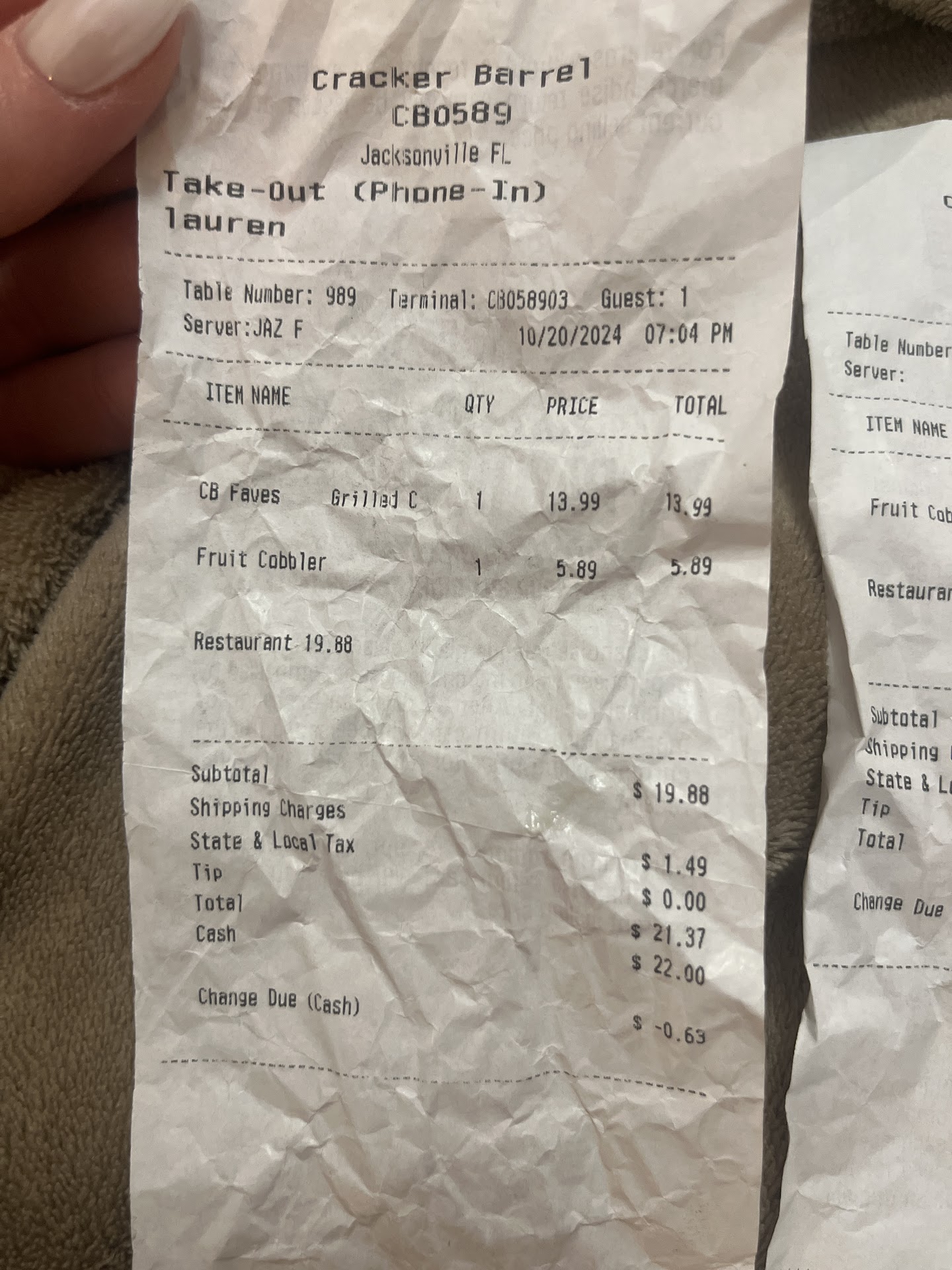 Read moreWe came to Jacksonville for an event over the weekend. On Thursday night of our trip, we decided to order dinner from this Cracker Barrel because we had a gift card and it was a mile from our hotel. We ordered our food as 2 separate orders at 5:45 on the phone because the internet ordering was not working for us. We were told our orders would be ready for pickup in about 30 minutes. So, we headed there and arrived right at 6:15. We paid for our orders before being told they were not ready yet. The staff member who checked us out said it shouldn’t be too long and they’d announce our names when the orders come out. Needless to say, we waited about 25 minutes (if you do the math, this is almost an hour from placing the order and being told it would take 30 minutes) before receiving our first order. It took another 10 minutes after that (now at 65 minutes past placing our orders) to get our second order. We left and drove back to our hotel. Upon arriving to our hotel, we noticed that both orders had no butter for the included biscuits with our meals, and the second order (it was catfish) had no silverware or tartar sauce (the menu reads it as if it is included).
