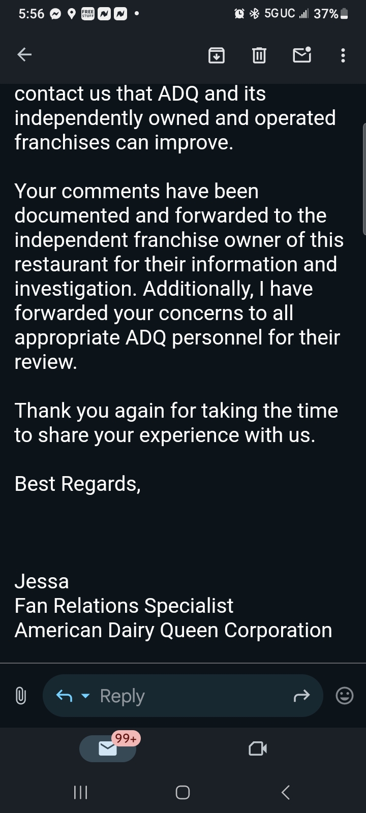 Can a manager reach out to me. This peanut in the blizzard is unacceptable. And yes it was a peanut because I looked at it,...