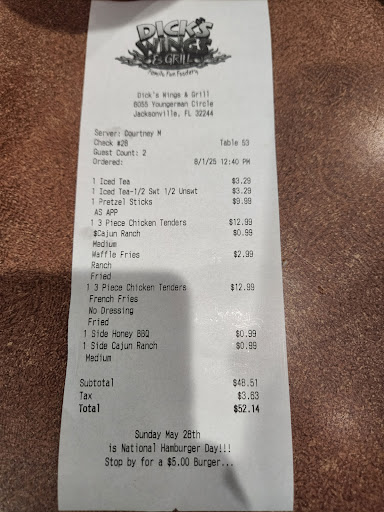Read moreNo one ever came to our table at any point. We waited and waited and the servers, which i thought were off work, were actually sitting at an adjacent table talking and counting tips. Eventually, another lady walking past smiled at us and when she walked back towards the servers she asked them who was suppose to be serving out table? One of them said I am, but she never budged to remotely move or get up to even greet us. Now, mind you, it was about 5:30pm and maybe 3 groups of people in the restaurant, INCLUDING our table. After waiting 3 more minutes thinking maybe she didn't see us, we left. The hostess asked us why we were leaving and we told her that no one came to our table. All she could say is "Oh, I'm sure it will be a few more minutes". Like, really? They aren't doing anything, she could have at least asked what we wanted to drink and introduced herself. We left and went to Longhorns Steakhouse instead, got fully serviced, with drinks, bread, AND OUR FOOD in the same time that we were simply waiting for service at Dicks. We decided to call back to tell a manager, and instead of giving me one, the hostess, which was the same hostess that sat us, asked when I was there and my name, then told me that the manager was in a meeting and will remain in one for another 1-2 hours. I've worked in a restaurant and there wouldn't be meetings lasting that long during the dinner rush at any restaurant. Very...