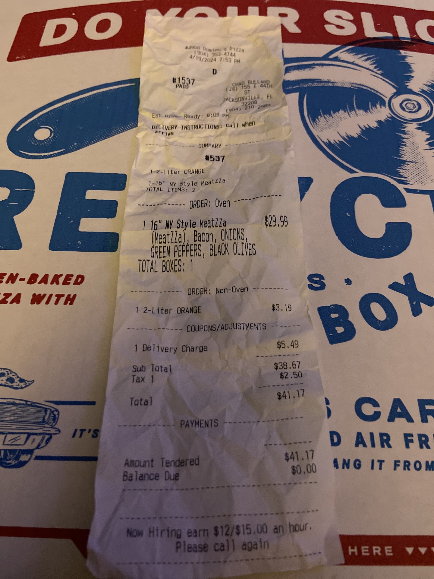 Ā Ā Ā Read moreWORST LOCATION IN JACKSONVILLE HANDS DOWN. THEY TAKE THE CAKE! IF I COULD GIVE ZERO STARS, I WOULD. Hereās the scenario folks: (05/07/2021) so I placed an order at 7:06pm, the driver leaves the store at 7:25pm. On my receipt, delivery says 38-48 minutes. I am mindful that it is Friday night. I decided to call the store at 8:25pm asking for them to contact the driver and asked for an estimate for my delivery. One to two hours was what I was told smh and they didnāt contact the driver, just said your food is on the way. Called back at 9:10pm, and I am told that they called me( which was a false statement, I received zero calls from dominoās the whole evening into the night) and that the driver couldnāt find my address(though I never got a call from the driver either, I even stood outside searching for a car with the dominos tag on the on top in case they happen to drive by). A couple other false statements made from them was that first, they said when they called, it went straight to voicemail, then changed it up and said that my number was disconnected. Then the āmanagerā says oh the driver mustāve taken the order without checking it out(how unorganized). THEN I hear in the background āoh.... her order is still hereā. At this point Iām livid, and immediately ask for a refund, he just says yea and hangs up on me!!!!! I call back, they denied my call. Called again and supposedly thereās only two members there working and Iām pretty sure the guy who I talked to wasnāt a damn manager. Just horrible customer service and no proper organization all over , they couldnāt even get their lies straight. DONT ORDER FROM...