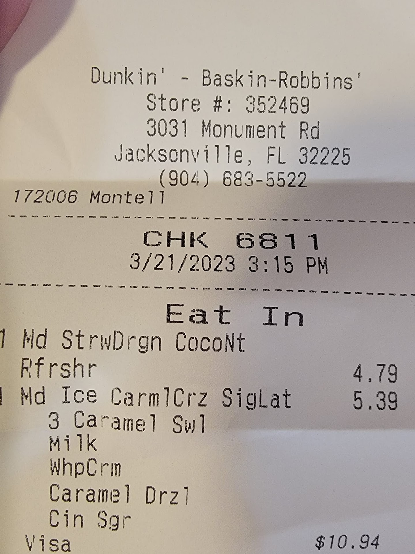 I order the Caramel or Butter Pecan Iced Coffee with extra cream. The cup should be mostly filled with ice and have a swirl of cream or lightness to it. It is not like this when you order here. The most recent visit, I asked them to please remake my coffee with a full cup of ice and extra cream. (The original one only had a few cubes at the top) They were very upset, rolled their eyes and were speaking about me amongst themselves, they seemed very confused by my request. The cashier yelled out "make it the same way". Thank goodness I was in the drive thru because if I was standing I am pretty sure I would have fell over. I waited and waited and she tried to hand me the little creamer cups for my "extra cream" while they took my new drink out of sight. At this moment I decided to drive off and leave the remade coffee that they took out of my sight as they were very argumentive and it did not seem safe and it didn't make sense why they would do...