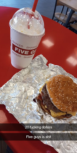 Read moreWent here for lunch, the place was pretty empty. Two other people dining in and one person waiting for a carry out. Three guys working inside, one on the grill, one on fries, and one had to come from the back to take my order. Placed my order quickly and waited roughly 15 minutes for my food. My burger was made incorrectly, the patty was way smaller than what I’m use to from 5Guys, and half of it was burnt and half of it was under cooked. This patty was the size a McDonald’s patty, seriously. The bun was soaked in what I assume is grease from the grill. The fries were soggy and didn’t taste fresh either. I’ve been eating 5Guys for years and this is the first time I’ve ever had a bad experience. The workers seemed more interested in cracking jokes with each other rather than paying attention and working. For example they placed the wrong order number on a dine in order and called the wrong number for at least 5 minutes before realizing they were calling the wrong number. I watched the worker take all the food out of the bag and place it in a new bag with the correct number. If you are wanting a good burger, do NOT go to this location especially during the week for lunch. I will drive a little further and go to the town center next time I want a...