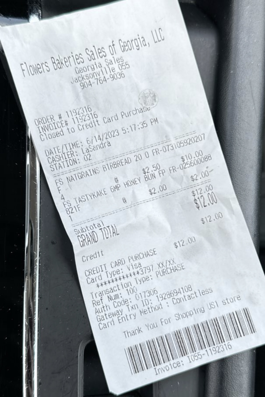 $32 bought 6 packs of snowball cupcakes (that I didn't get) so I can make 2 snowmen on a Christmas cake (along with 4 loaves of Dave's bread @2/$7.00 2 packs of mints and 2 boxes of peanut butter Buddy Bars. I arrived home without my white snowball cupcakes to make the snowmen on the cake. I learned Flowers doesn't take American Express, nor do they accept $50 bills. So I had to run to the car to get an additional $20 so I could pay the $32. When I returned to inside the store, I thought today's clerk bagged all my groceries, Ipaid, didn't get a receipt and left with 2 bags of groceries, NOT KNOWING my white snowball cupcakes weren't in the bags. I don't know if the clerk did it on purpose (to spite bcoz I had to run to the car to get an additional $20 bill bcoz she didn't accept a $50l or was it on accident. Since she didn't give me a receipt, I wonder if it was do e on purpose. Now I don't trust that little clerk. I may just do all my shopping Costco since I no longer trust Flowers Bakery near Arlington on St....