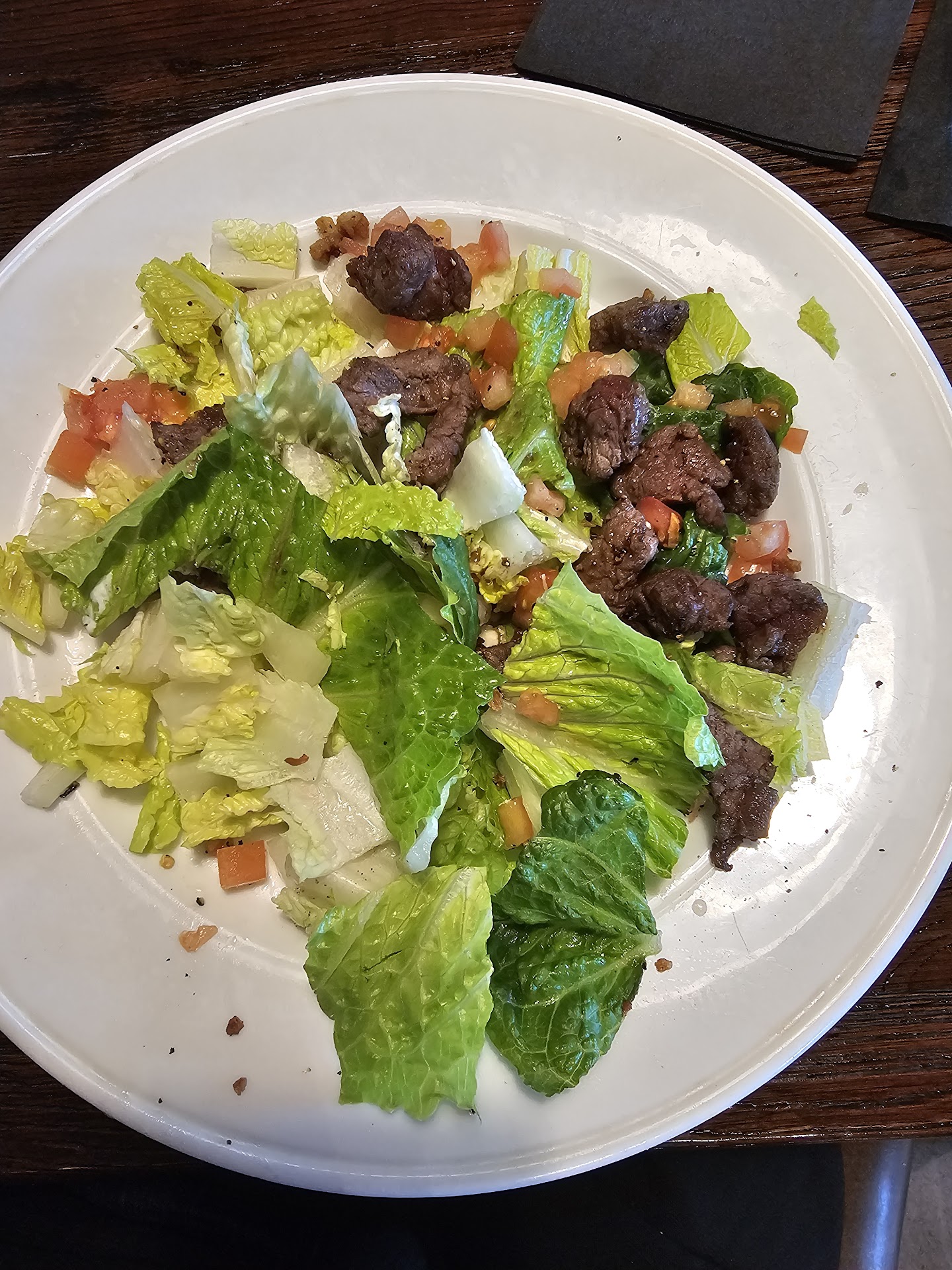 Definitely won't be going back! Appetizer was fried mushrooms for $10.95, which litterally was 7 mushrooms, seven! For dinner, I ordered their version of a "black and blue salad". Basically, it was supposed to be a grilled steak sliced and served atop salad with tomatoes, bacon, and blue cheese crumbles. I ordered blue cheese dressing on the side instead of the vinaigrette it came with. They asked how I wanted my steak- medium rare. The picture is what i was served. Not only was it tiny, but, the "steak" was NOT a steak! It was COLD, leftover chunks of gristle and fat with a couple chunks of meat. Extremely Cheap stew meat browned and left to get cold. It also had zero blue cheese crumbles and the wrong dressing!! I asked for my blue cheese dressing and why the blue cheese crumbles were missing. They brought me the correct dressing and again, i asked where the blue cheese crumbles were. "Oh, we are out. We used the last to make the blue cheese dressing. I'll go get more dressing." Then, she runs off and comes back with another little thing of dressing and said "blue cheese dressing has blue cheese crumbles already in it" then walked off!!! Seriously!?!? Our waiter didn't care when I brought it up to him either. He just laughed and walked off. Then I finally took a bit of what I was left to eat as they were definitely not interested in making it right at all and.... cold, fatty, chewy, full of sinue meat! Absolutely awful!! I ate a few bites and pushed it to the side of the table. The waiter came back and asked if he could take the plates on the end and, once again, just laughed and walked away when I told him the meat was cold and it wasn't what I wanted without the blue cheese crumbles. I was meeting a friend whom I rarely get to see and we were trying to just visit and catch up when he just brings the checks. No offer of dessert or asking if we need or want anything else. We paid. My bill was over $30 for 7 mushrooms and the pitiful salad in the picture that, yes, this was taken before I even took a bite! Then, he took our water glasses while we were sitting there chatting making ZERO effort to get up to leave as we were immersed in conversation!! Basically, a "get out" move!! 20 minutes later, Allen, came over and asked us if we wanted water or anything while we waited since he noticed we had nothing. Allen was super nice and I wish he had been our waiter but, we will never know if he is better as I will definitely not be going back. I had to buy myself food on the way home!...
