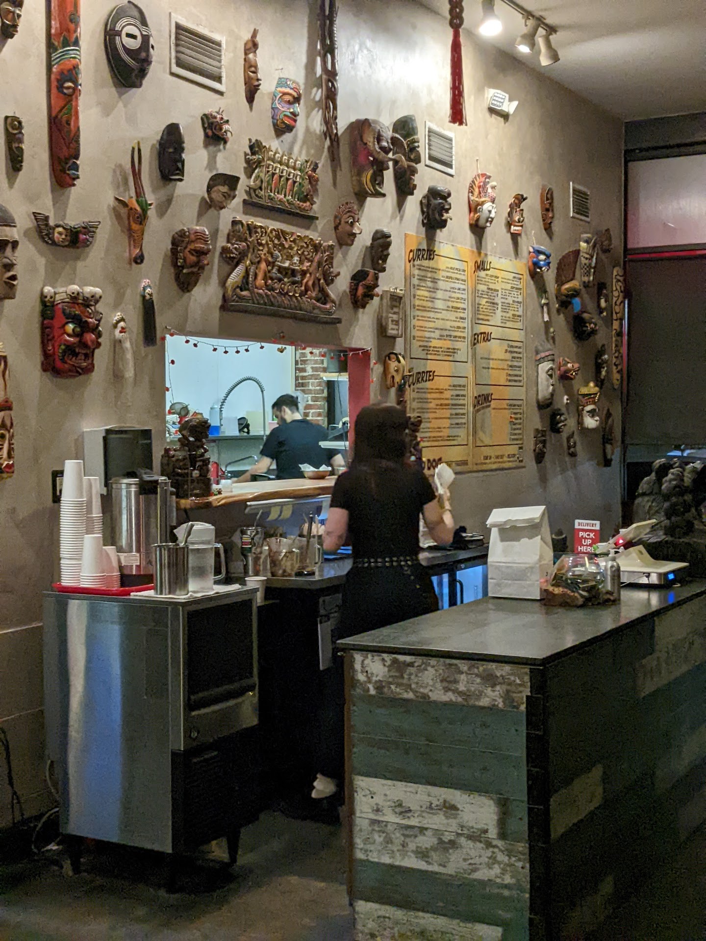 This place is a cool addition to Riverside. I don't even know what was in that building before them but thank you guys for being in there. I brought my Non-curry eating grandma to Foo Dog and she loved everything she tried. It was a whole new world of flavors for her. My grandma was slightly terrified of the mask on the wall. She kept saying they were devil worshipping mask so I pulled out my phone to convince her that they were nice mask. The portions seemed smaller when they first opened. I remember feeling hungry when I left and lately the portions seemed like they've increased. I don't think my stomach got smaller which probably means they increased the portions. I wasn't upset about the price of the meal anymore I remember feeling fancy because I was spending about $45 for two people. Its cool now, I usually have leftovers for the next workday now! Definitely get the curry chips. I've had them about 10 times. 9 out of 10 times they were good. There was only one time the chips seemed like they were a bit older and they weren't crispy like they usually were. I didn't say anything because it was later in the night but 9 out of 10 is still pretty darn good! The staff is pretty friendly too. The place is small and cozy. The temperature of the room is pretty moderate. They have a lot of vegan options which is cool because I'm vegan. The tofu is very crispy. I can't think of anything else but definitely try this place out guys!