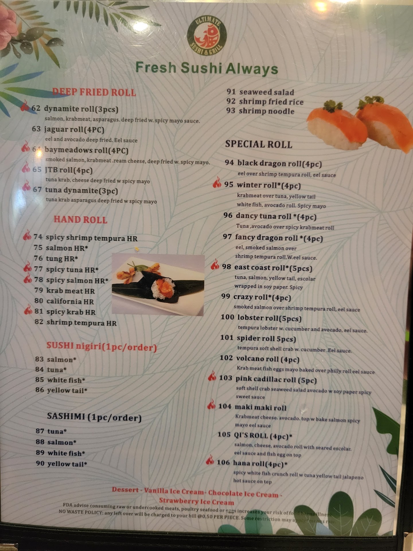 Read moreThis was the worst experience I’ve ever had at a restaurant as a FIRST TIME CUSTOMER at this particular location other location which I visited the server come and greet us as well ask if we were first timer here and most Fuji sushi location aren’t all you can eat, which they explain before we sat down anyways, from the moment we walked in we weren’t greeted, after we were sat no one explained how the menu worked to us and instead we had to figure it out on our own by going online and searching the reviews. We saw a picture of a small piece of paper marked off with numbers and that’s how we figured out how to . Once we put our order down on a small piece of paper, with little boxes for you to write the numbers of the items off the menu, a staff member finally came up to take the paper and finally explain the way the menu works to us. I’m guessing since they have an all you can eat sushi special deal all day they don’t want you to share the sushi, which is what we were trying to do. Every time my fiancé and I go out for sushi we order a couple of rolls that we both like to share. Each sushi usually comes with 8 to 12 pieces which is perfect for us to share and take a few pieces home. Which is why when we noticed the sushi on their menu only comes in 4 pieces we were really confused. Once the sushi came out everything was fine not great or amazing but our server never came to check on us again until we asked for our check. I wanted to do another round of sushi so I took another piece of paper, wrote down what I wanted and left it on the same spot of the table as last time and no one came to pick it up. While we were eating a family of 3 came in and got completely different treatment than we did. They had the same server as us and she was much nicer to them, smiling at them, letting them move to another table and talking to them way more. At that point we could only assume that they were regulars which after my experience today I could never understand how this place has regular customers returning. My biggest problem with this place is that they don’t have a menu option for people who don’t want to do all you can eat sushi. A regular menu with bigger portions than 4 pieces of sushi and each roll is priced individually. Don’t get me wrong, all you can eat sushi for $22 is not bad at all but there really needs to be a separate menu option for people who don’t want to do all you can eat and the menu needs to be explained much better.