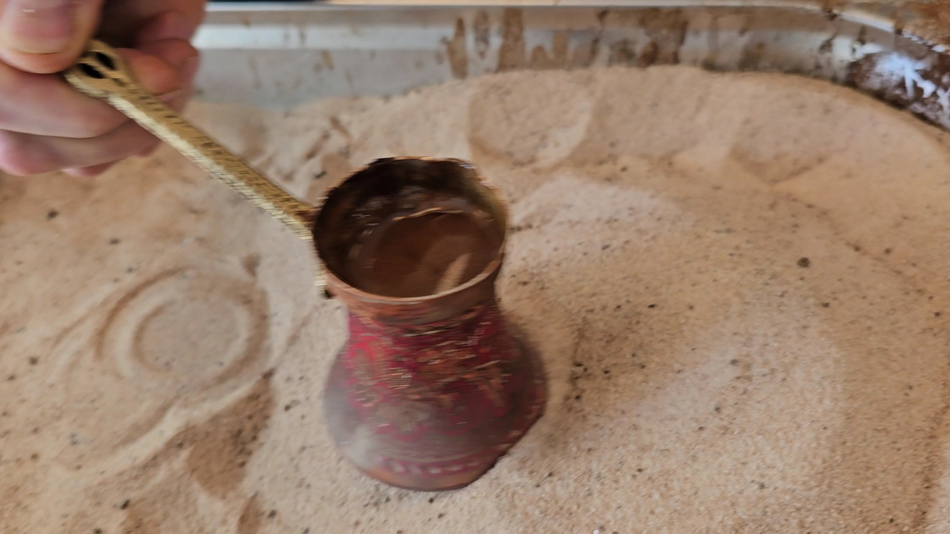 Situated on the counter is a small island of heated sand. A specially designed cup holds the thick coffee, which is then buried deep into the hot sand, causing the coffee to boil in a matter of seconds. It's fun to watch and resembles hot chocolate boiling in a pan. The sand is much hotter below the surface which is why the coffee boils so quickly. This method was first used by the Bedouins in the desert and it's the standard for making Turkish coffee today.