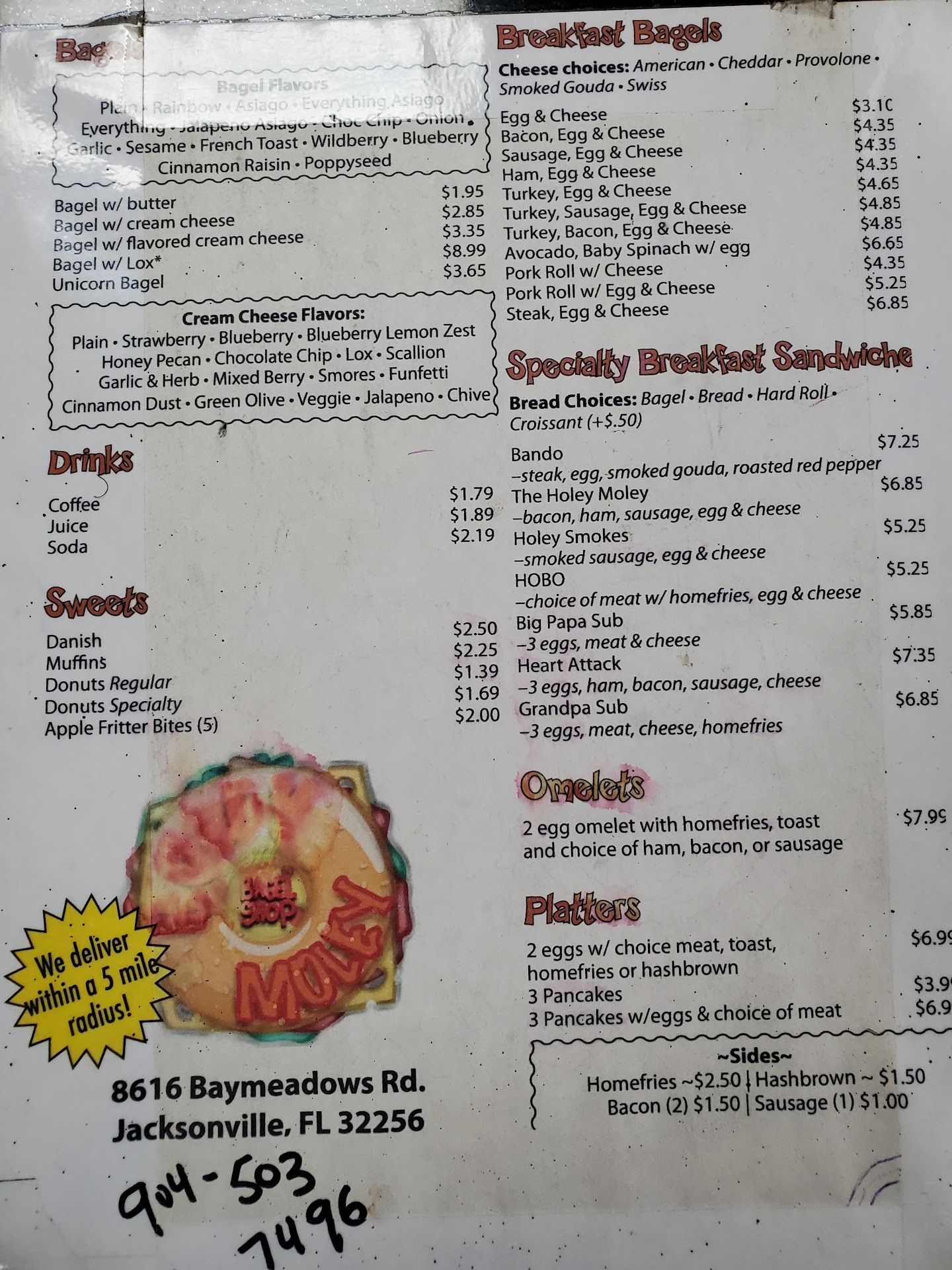 Read moreSaw a coupon in the local Coupon Magazine for a buy on get one free NYC Bagel đ„Ż sandwich so we figured why not. First parking is good but this strip mall needs to be cleaned more often as trash cans are over flowing and stuff is flying around so ZERO â. Now I cannot hold this against Holey Moley. Entered and warmly greeted. Sandwich selections are written on a Blackboard so reading them is a bit of a challenge. Wanted Lox, Cream cheese, onion but they were sold out of Lox so we settled on Lox and Cream Cheese mix on Sesame Seed and another on Everything Bagel both very good 5 â. Bagels were so good we took home 6 for $7.89 which is a good deal 5 â Just know that they are busy with hours only from 8:00am till 1:00pm on weekdays and 7:00am till 12:00 noon on Sunday and they do sell out of items which to me is good as everything is fresh. We plan to return ty try the many different sections so suggest...