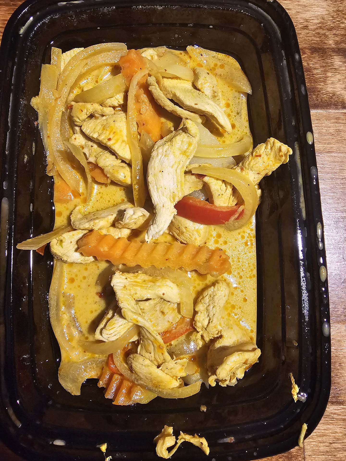 Our food came out VERY quickly...which you think would be a good thing. But it came out so quickly it almost made me think they had it prepared ahead of time and threw it all together. Worse than that it had virtually NO sauce on it. Just like any other Thai place you get a hefty potion of rice, meant to sop up all the delicious curry juices. What did they think I was going to use my rice for? The 3 tablespoons of sauce had already been absorbed by the potatoes (yes you read that right potatoes) in the dish. My friend and I each asked for more sauce (since we had gotten different heat levels) and they brought us out one dish of who knows which heat level. Our dishes are now at an edible level so we carry on with our meal.