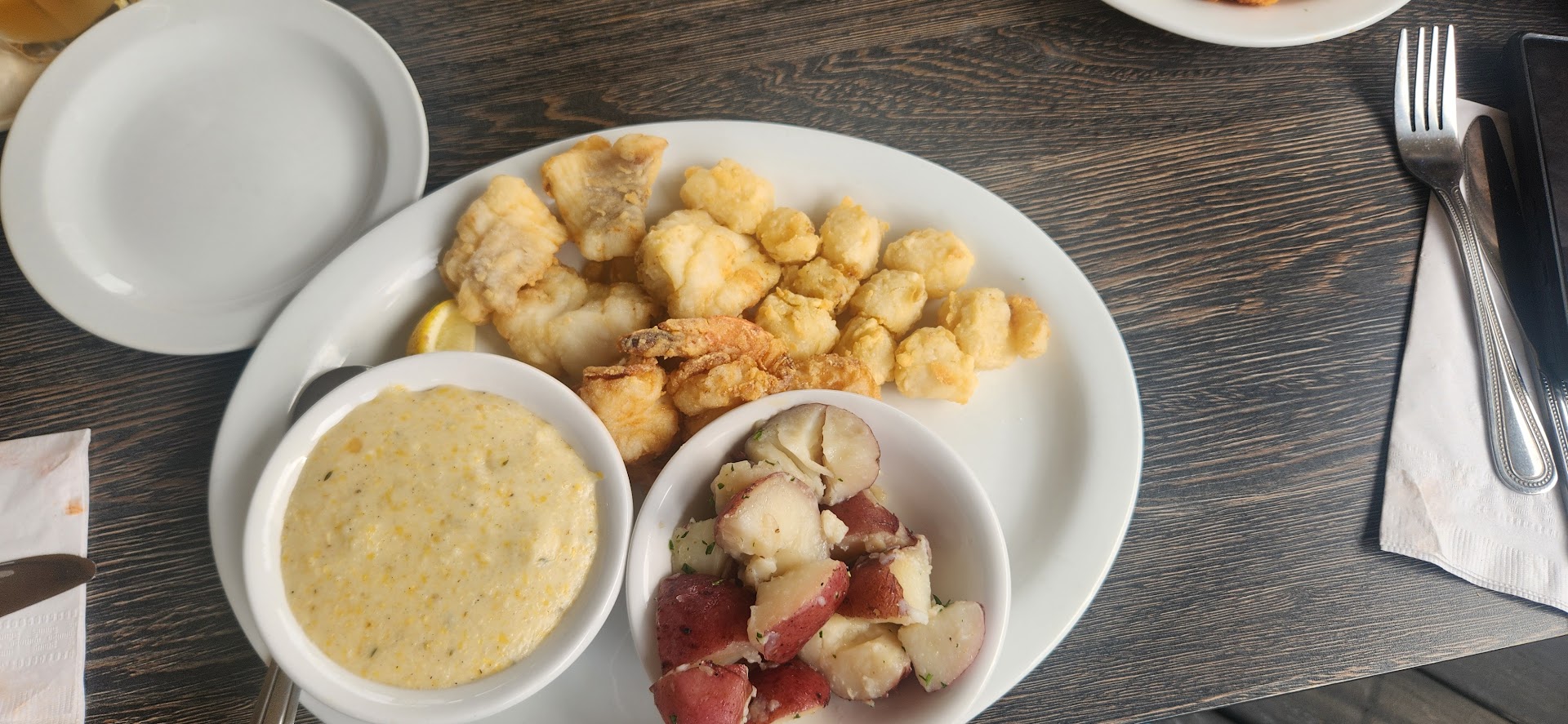 But wait, the real showstopper - the food! Brace yourself, my gluten-free friends, because guess what? They have a dedicated gluten-free fryer! Yes, you read that right - you can indulge in crispy, golden gluten-free fried seafood here! I dove headfirst into a smorgasbord of fried calamari, fish, shrimp, and scallops, all perfectly coated in a gluten-free batter. It was a revelation, a feast fit for a queen! Paired with the creamy grits, it was a match made in seafood heaven.