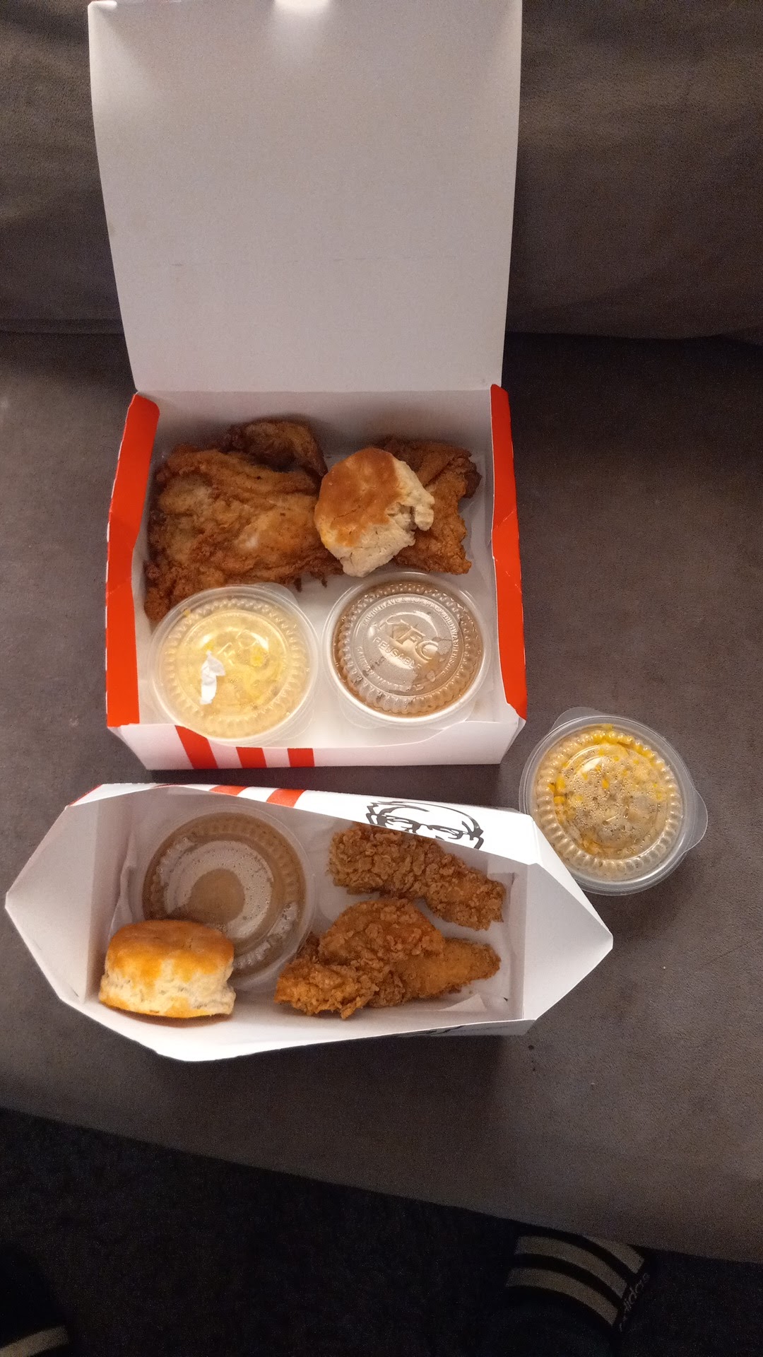 Read moreI'm sorry KFC. Don't know if it's just this location or KFC in general. KFC used to be my favorite fried chicken chain, but, in my opinion, over the last few years, it has really gone down hill. I placed an online order. I couldn't find anywhere to delay the time for the order to be ready. I wanted it to be as fresh as possible when I picked it up. The order was ready when I got there. When I got home and started unpacking, the first thing I noticed was that my side order if fries was only about 1/2 full (no, fries were not spilled in the bag) and were not crisp. They were limp and soggy. Next I noticed that the biscuits were not in any kind if box, but rather an open container similar to the French fry container. The biscuits seemed much smaller than I remember, definitely smaller than a popular competitor, and were very hard. I open my bucket of chicken. I ordered extra crispy, relieved original. I ate one wing and one breast. Both were very dry, and all of the pieces of chicken seemed to be rather small. It all gave me the impression that it had been sitting under a heat lamp for hours. I moved on to my "spicy" chicken sandwich. When I unwrapped it, I wasn't even sure it was a spicy. I was expecting a reddish tinge to the breading. I took off the top bun, and there was one small spot, about the size of a half dollar, of a supposedly spicy sauce on top of a regular patty. As I said before, KFC ha really gone down hill over the last few years, in my opinion. I didn't even bother to drive all the way back across town to complain. Didn't feel it was worth the time...