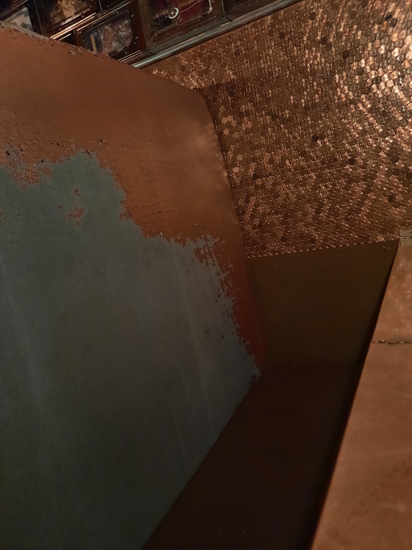 Stay away from this place!!! The place is totally outdated, dirty and filthy. I literally had to wipe the table myself with wet wipes, because our hands were sticking to the dirty table. There was no hostess at her workplace when we walked in so we assumed that when we sit down the server would come to us but no, we waited for 10 minutes, no one came over to us. So we had to walk out and walk back in after seeing the hostess returning to her workplace, she literally said with poker face:"How many? Inside or outside" and then threw 2 menues on the table and left, me and my husband both agreed that she was high, she was obviously under sth. Our server didn't care about the service quality and we realized why only at the end, the automatic 20% gratuity after 10pm (I don't understand why your place equals itself to some fancy places like Country clubs or 4-5 Restaurants with 20% automatic gratuity). And we usually do leave 20% tip to the servers but we would like to have such an option ourselves and if not it's obvious that the service should be then excellent, but not here... My photos show how horrible and outdated the furniture looks like, I literally was seating straight in order not to touch the booth with my back. Ladies room had a broken lock, which I noticed only after someone broke in while I was inside, there was toilet paper around trash bin, and the floors were super nasty, God knows when they were washed last time. The whole place needs complete renovation, it needs deep cleaning, and dusting and if you think that by building the walls from pennies and having such a beer variety (which is obviously not as many as you advertise on your web site) you think your business will live? We came here on Saturday and the place was almost empty, which now we understand why. The food that we ordered came super greesy, undercooked. My beer glass was dirty so I had to drink it from the straw. I will give you a free marketing advice: with such a beer selection you don't do samples and you don't have beer flights, do you even have a marketing manager? This is number ONE thing you have to do if you want customers to come back! You have to have customers try your beers and then like them, and then come back for that beer, but with purchasing the whole glass how people are supposed to find a beer of their taste?! I'm attaching the photos so that you can see yourself everything. We are obviously not coming back here! We were so disappointed that night that we started to look around and there is actually very nice place called Garage, it's literally a block away, so we went there, it had a live music and that place totally made us forget our bad experience...