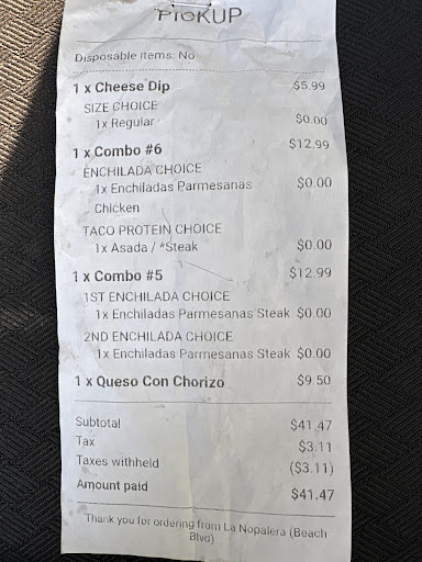 Read moreDo not order uber eats. Iâve ordered from them 4 times because they are right across the street from where I live and their food is good. However, I finally got tired of getting the wrong order so I decided to bring it to their attention. Went back to the restaurant and explained I ordered a chicken enchilada and I keep getting beef. They explained to me that it is an up charge for chicken but uber doesnât do the up charge on their side. So they see that it should be a chicken enchilada but since it isnât charging, they are deliberately using beef instead. Also, when you go to rate your order and make a comment about this, theyâve also made it so you can not go back and see your virtual receipt to do so. Just thought that was pretty awful business practice especially because most people wouldnât go back to figure out the issue and realize itâs deliberately done and itâs the restaurants fault for not changing the price on the app but instead of fixing the problem they deliberately give you the wrong order. Youâd think youâd stop using uber as a business if they canât update your prices, that was the excuse the manager gave anyway. The manager also recommended I stopped using uber eats and just to call but no one ever answers the phone. Thatâs why I came to the restaurant in the first place as well; because they wouldnât pick up the phone⊠which could be blamed on how busy the business was but when we came into the restaurant it wasnât busy at all. There were two guys at the host stand staring at their phones. Was just really disappointed. The food was pretty disappointing this time as well. The chorizo con queso was maybe 20% queso and 80% oil. Seems like theyâve lost integrity or maybe they...
