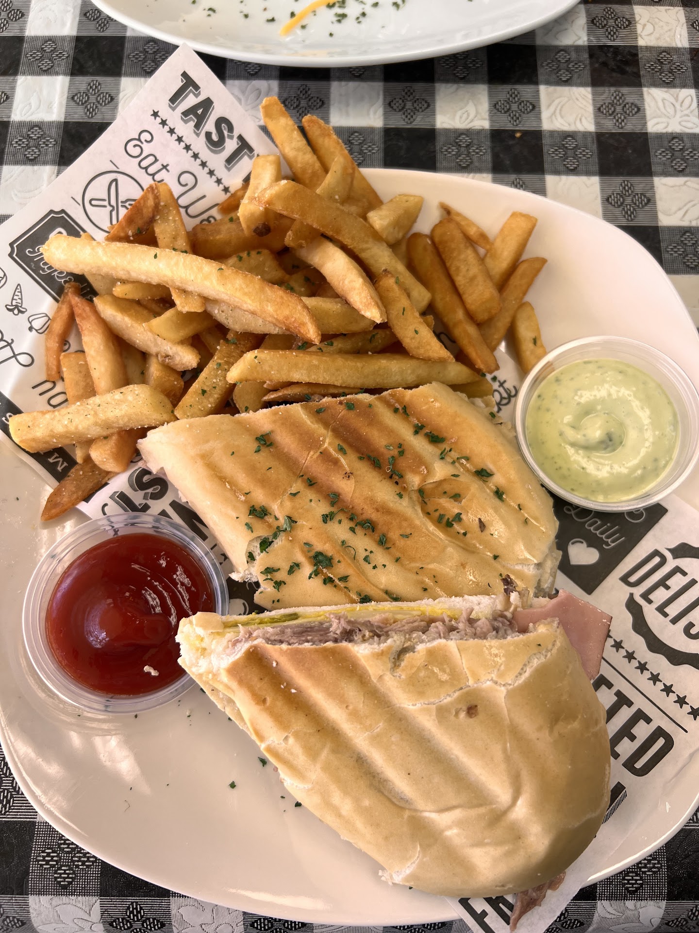 I got a cuban which was delicious. The bread was grilled amazingly and the meat, mustard, and pickles all worked in tandem and made an amazing sandwich. It also comes with fries., which were surprisingly good and well cooked, alongside a salsa verde/ crema which was my favorite part.