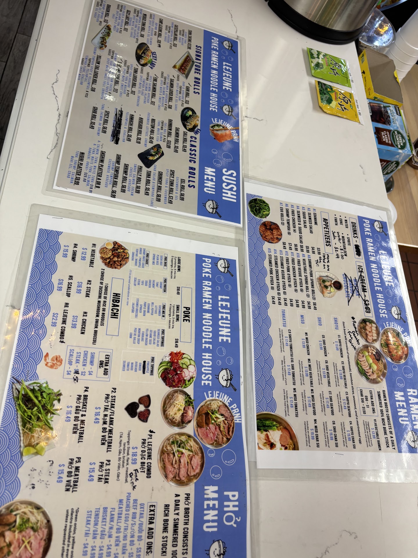 Lejeune Poke Ramen Noodle House is a fantastic spot for anyone looking to explore something new, especially if youâre used to only being exposed to American foods. This place offers a great opportunity to step out of your comfort zone and try fresh, flavorful dishesâjust donât expect the overly salty, Americanized flavors you might be accustomed to. The menu has a wide variety of options, from hibachi and sushi to ramen and pho, so thereâs something for everyone.