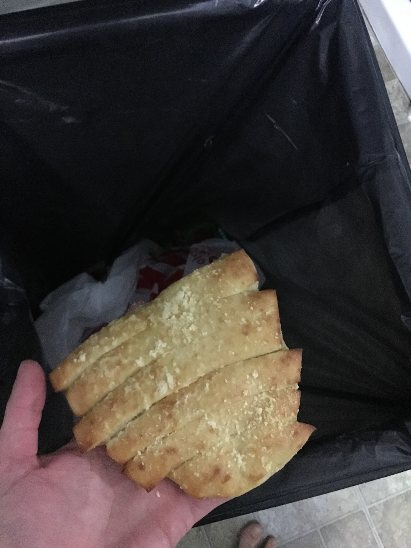 The cheese pizza was marked 10. I assume that's supposed to be when it was made. I was trying to eat it at 10, after we got home, and it tasted like it had been sitting for a long time. It's going in the trash too. I just couldn't swallow it. I've worked at a franchise pizza place before, and eaten my share of old pizzas no one ever picked up hours after they'd been ordered. This is like a pizza that had been drying out under a heat lamp for 4 or 5 hours and gotten way past the point anyone should attempt to eat the thing.