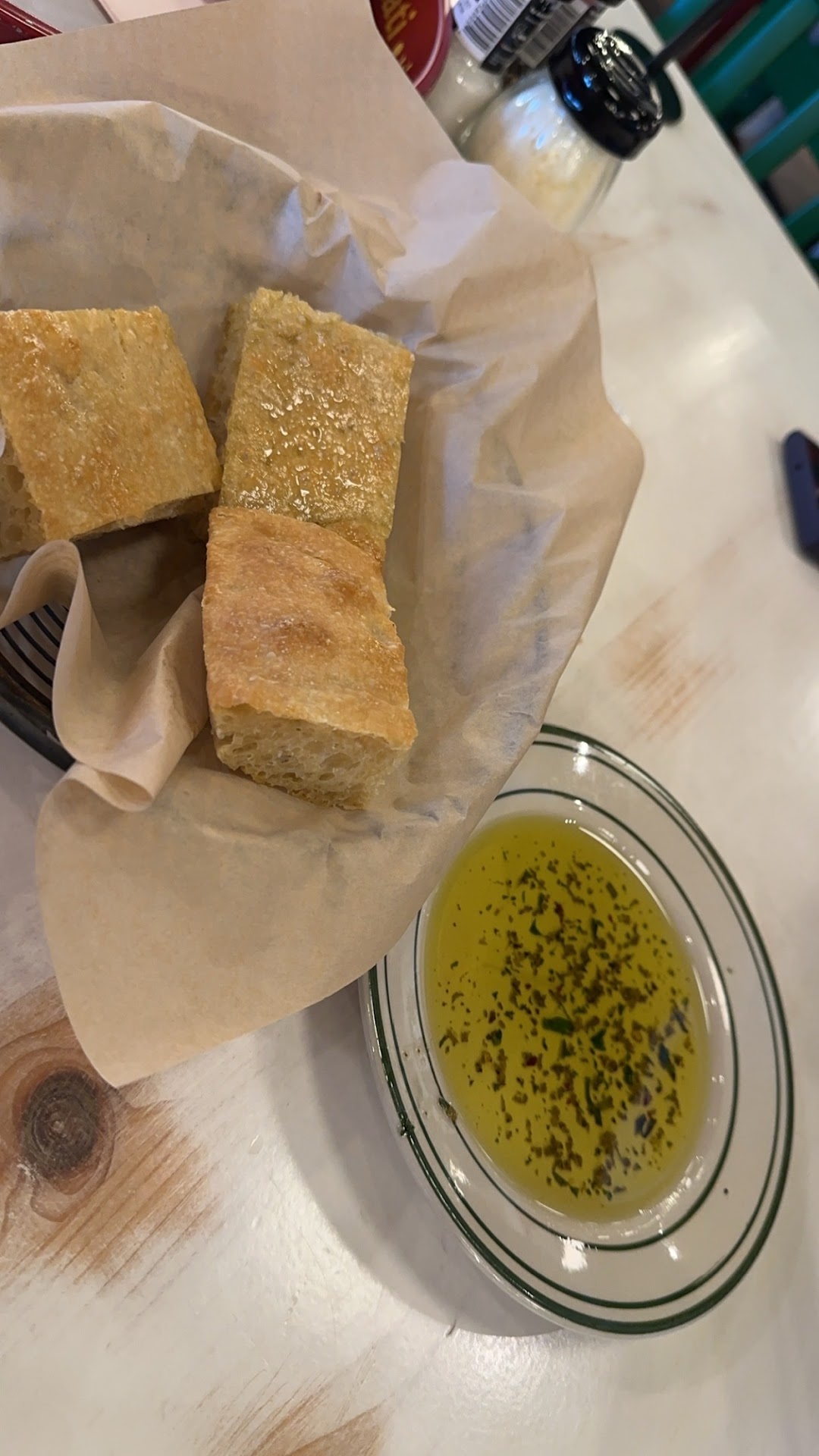 Food: we all ordered different dishes. The pasta with white sauce was edible, the pizza less then mediocre. We ordered garlic bread, which unfortunately was not edible ( how can you mess up garlic bread????). The bread had no Garlic! It was decent Italian bread with a 1/4" dry parmesano mixture that fell off like powder when picked up. Then it was seasoned completely wrong with too much Oregano and already mixed up Italian spices, truly sad! I had chicken parmesano. It had an unidentifiable weird under- taste that my granddaughter immediately called out as "tasting like the pan". The meat tasted to me as it had been frozen too long, and the texture was off. A good chicken parm has a nice seasoned breading, this one had no taste whatsoever and instead one slice of maybe Romano/Parmesano halfway melted on top. The spaghetti that came with it were not fresh but rather gummy, as if frozen and re-heated. The red sauce was so over-salted that I could not even eat it, and the little I placed into my mouth, left a burning salty sensation that I could not loose, not even with a whole cup of the bitter sweet tea available.