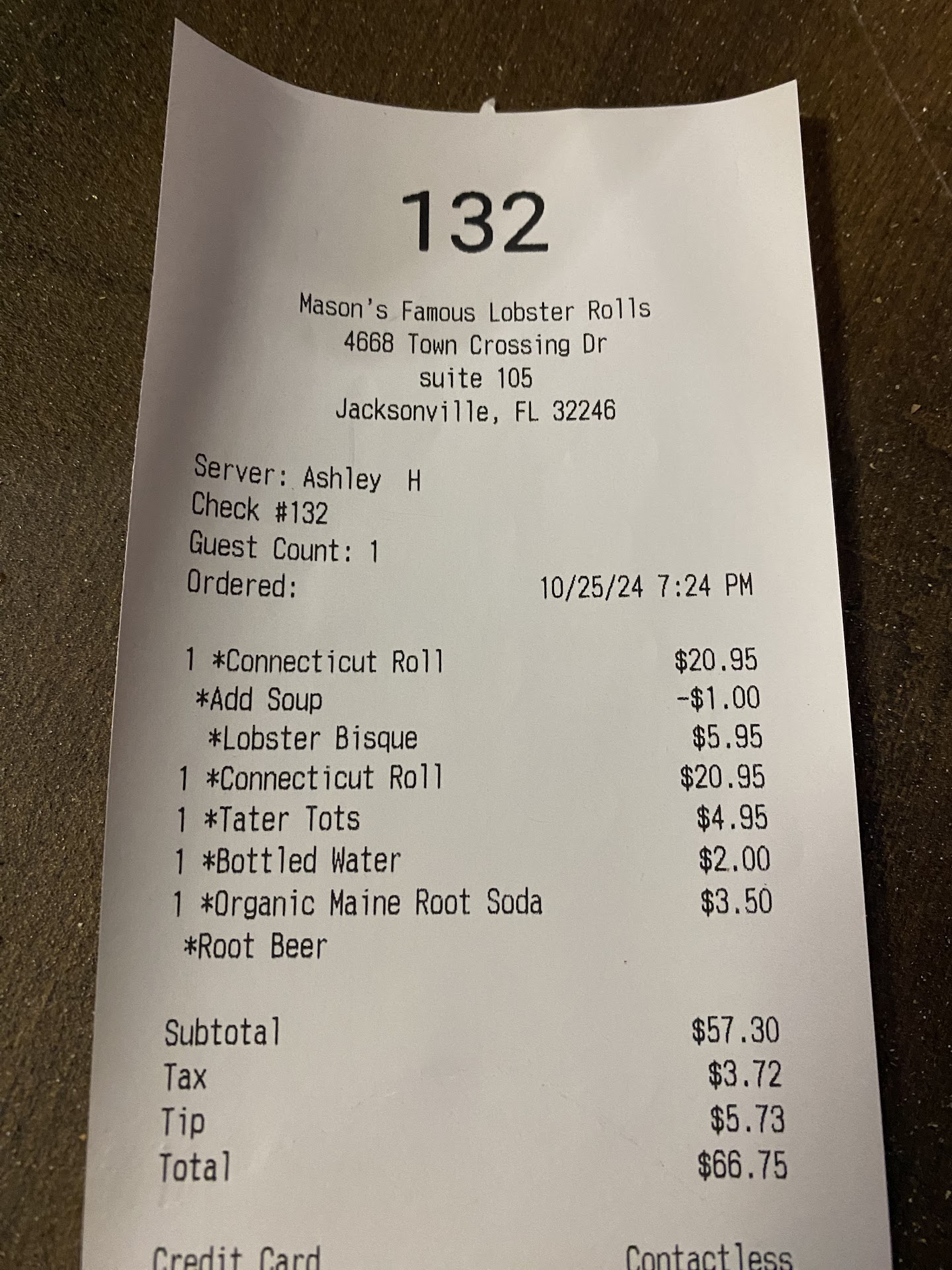 We spent about $65 with tip. Overall, we could have gotten a much better meal for $65. We ordered two rolls. One as a combo (with soup) and one with a side of tater totts, with a rootbeer and bottled water.