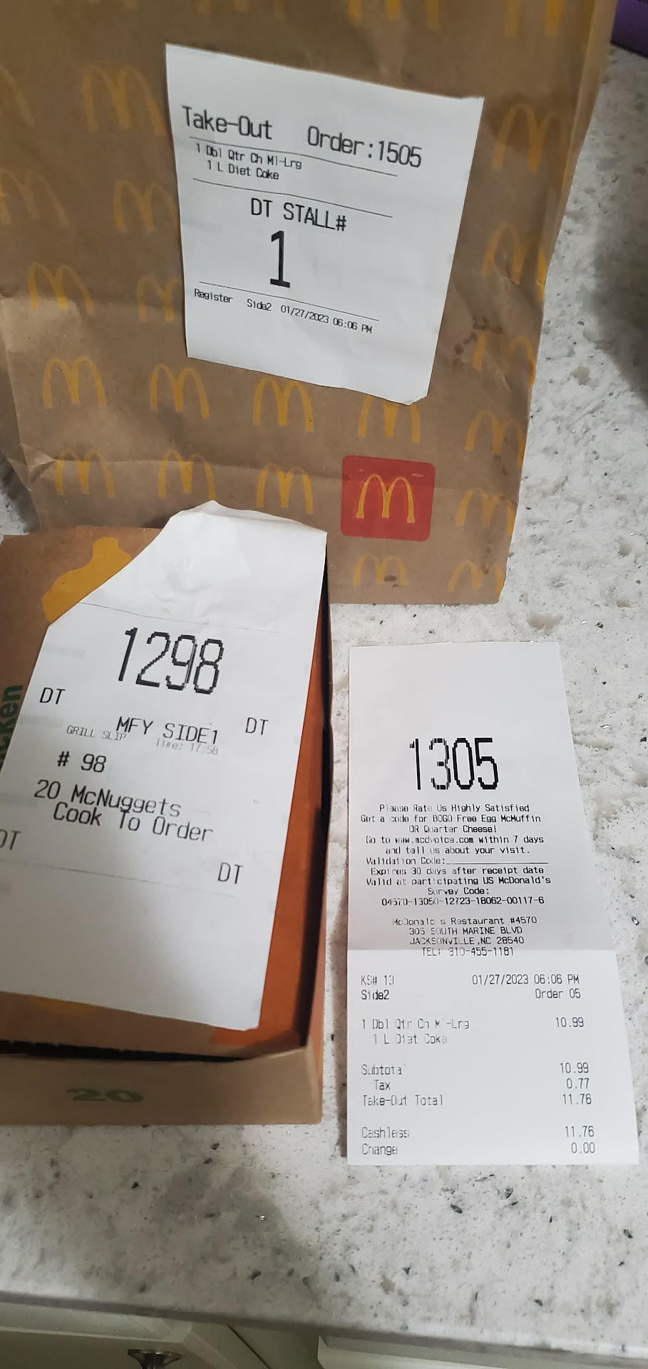 Read moreThe cashier seemed more interested in talking to an off the clock employee and socializing then she did helping us with our order since the machines they have set up to give your order was not working properly and did not even print out a receipt for us to take to the cashier. Pretty certain they gave us the wrong size frappe but after that point we just wanted out of the store. Whomever made our McChicken did a great job however we had asked for extra pickles and they put two little pickles on each. The chicken seemed fresh though which is odd when going to this McDonald's. It is known as the worst McDonald's in this area and you only go there when you are desperate to put something in your gut. I honestly don't even know why you had a cashier up there. And the language in which they were having their conversation was not appropriate to be running such a well-known business. We praise the Lord our kids were not in there with us. The hand dryers in the bathroom barely work and there are no paper towels and I can't tell you when the last time the bathrooms were serviced. You do have good employees there some of them anyways and it is horrible that they get a bad rap for the employees that just want to ride the clock. Seriously can't believe these are the people who are wanting $18 plus an hour and all they do is stand there and begrudgingly help you when...